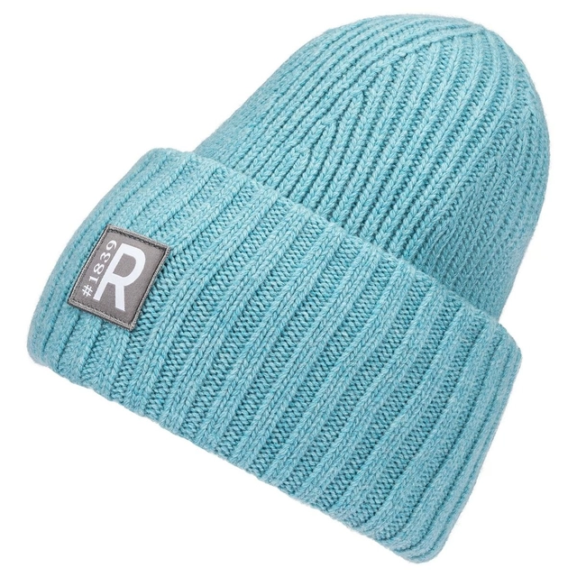 Vācu zīmola Roeckl silta un bieza rievota adījuma cepure gaiši debeszilā krāsā ar lielu atloku un kontrastējošu zīmola logotipa uzšuvi.