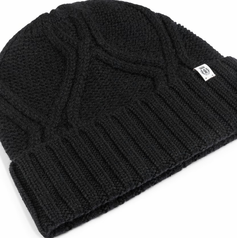 Vācu zīmola Roeckl adīta sieviešu cepure ar dekoratīvu rakstu melnā krāsā. Izgatavota no mīkstas 100% kašmira dzijas. Papildināta ar rievota adījuma atloku un kontrastējošu zīmola logotipa emblēmu.
