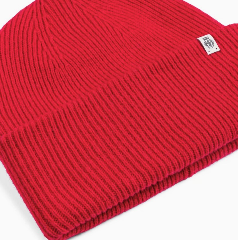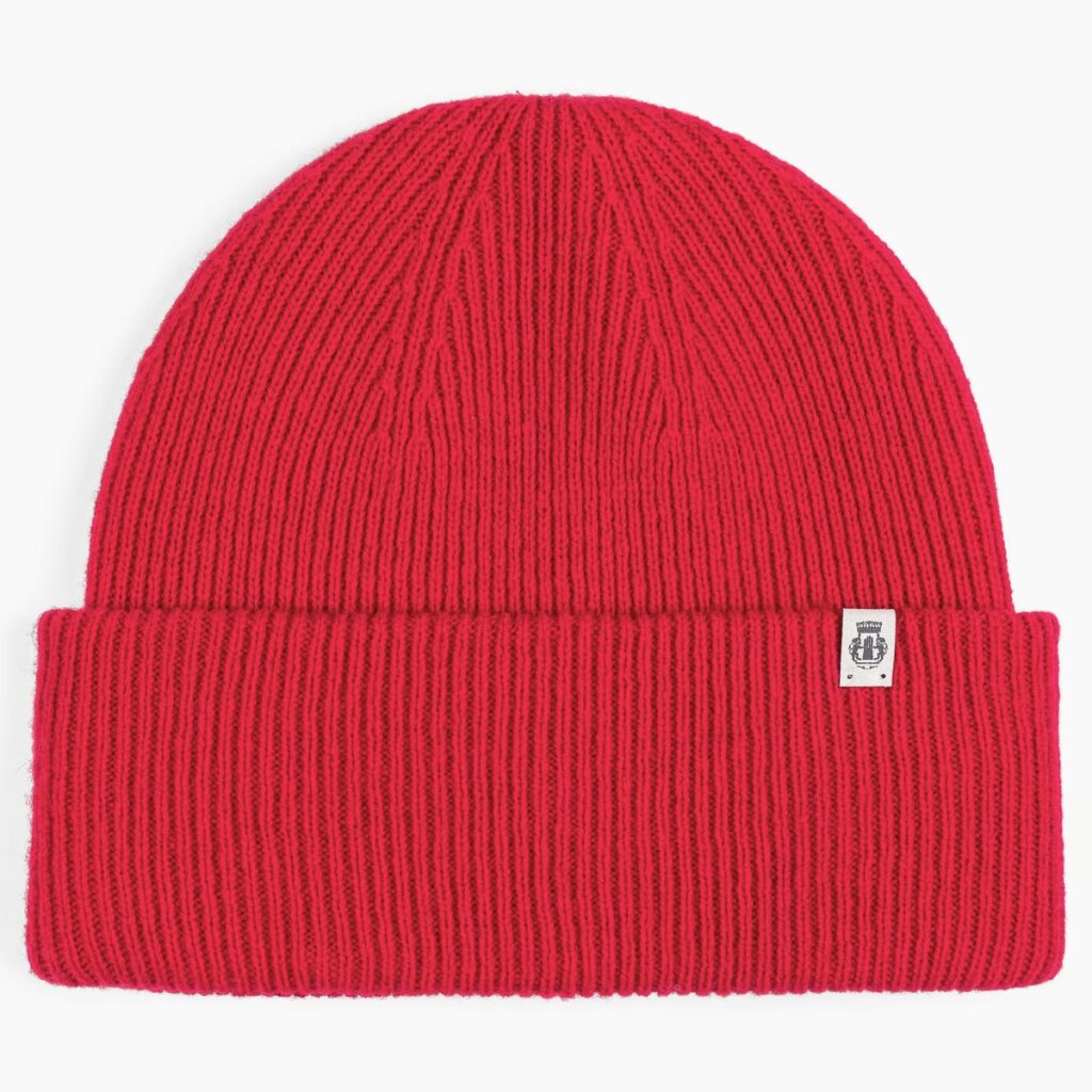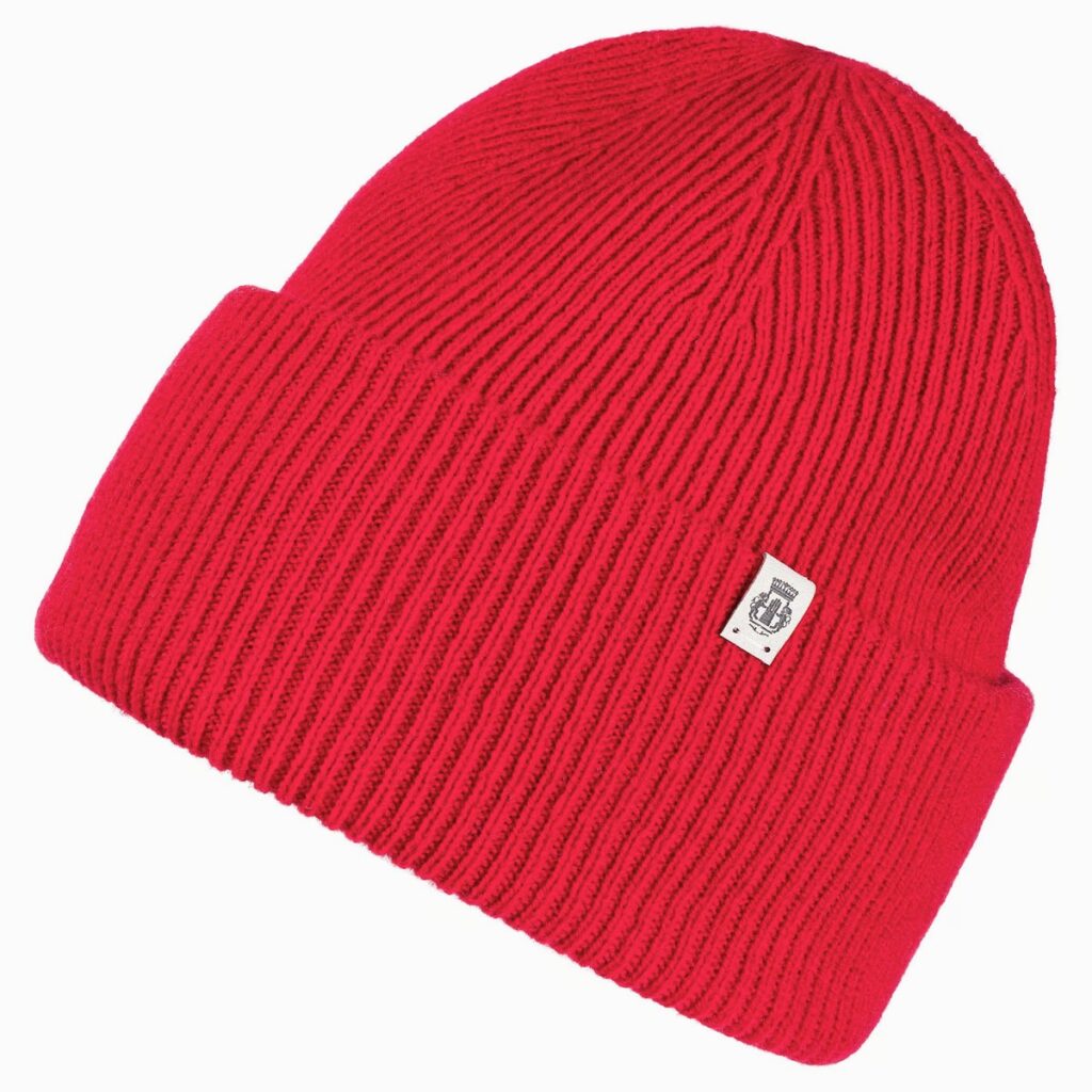 Vācu zīmola Roeckl smalki rievota adījuma cepure sarkanā krāsā. Izgatavota no mīkstas merino vilnas dzijas. Papildināta ar kontrastējošu zīmola logotipa emblēmu uz platā atloka.