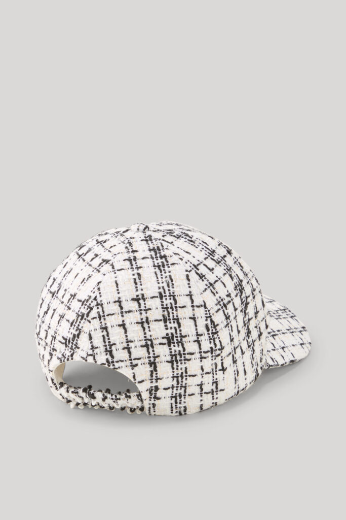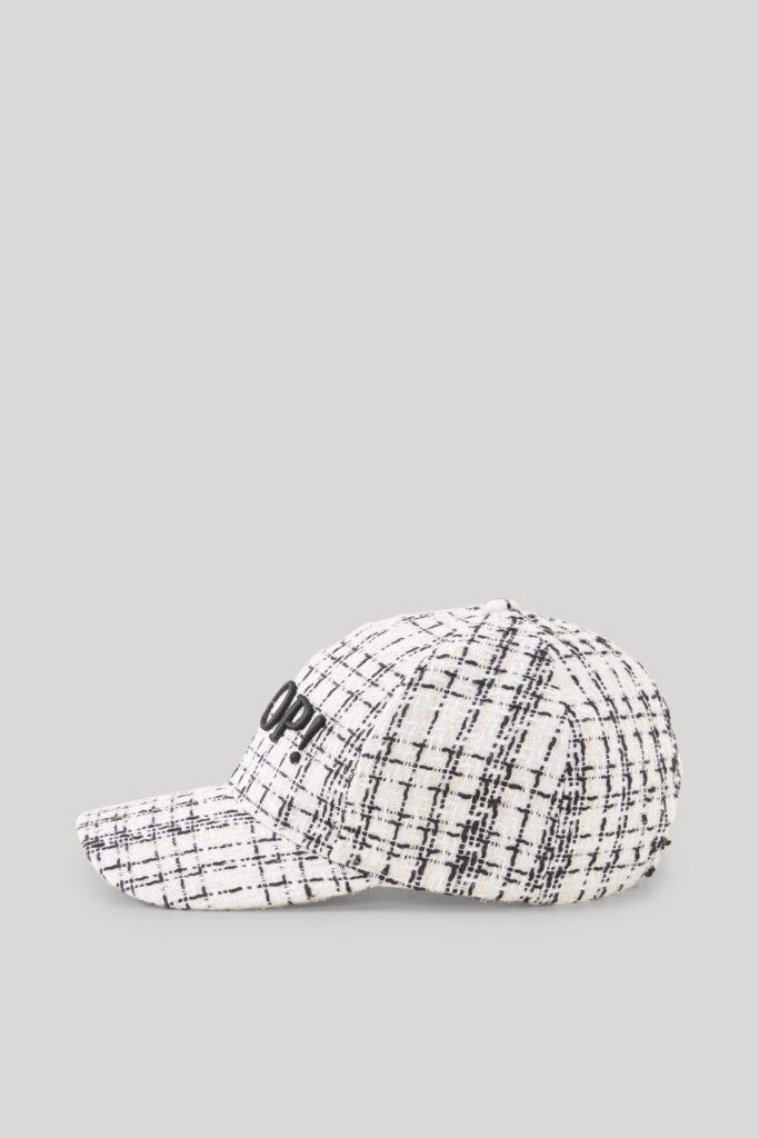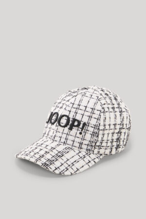 Vācu modes zīmola Joop! krēmbalta sieviešu beisbola stila cepure ar kontrastējošu rakstu. Izgatavota no teksturēta tvīda kvalitātes auduma ar zeltainu mirdzumu. Papildināta ar elastīgu lentu mugurpusē. Akcentēta ar melnu zīmola logotipa 3D izšuvumu.