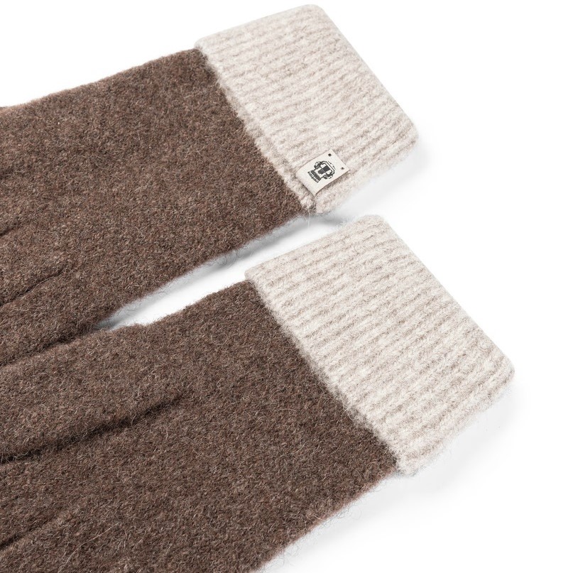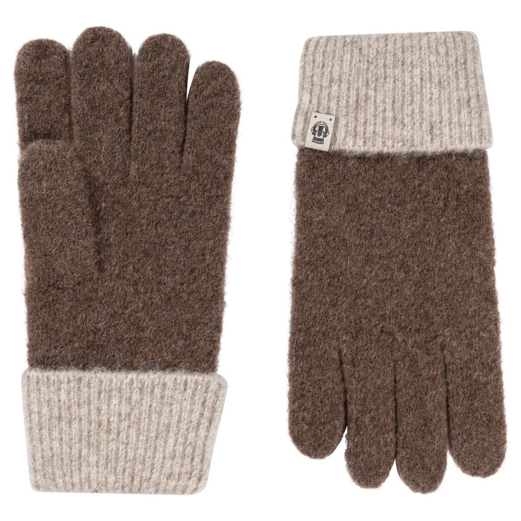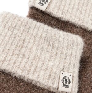 Vācu zīmola Roeckl adīti sieviešu pirkstaiņi pelēcīgi brūnā krāsā. Izgatavoti no viegli pūkainas un siltas alpakas un jaka maisījuma dzijas. Papildināti ar gaišākām rievota adījuma aprocēm. Akcentēti ar zīmola logotipa emblēmu.