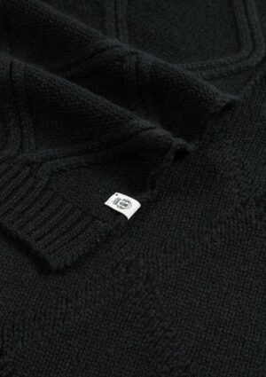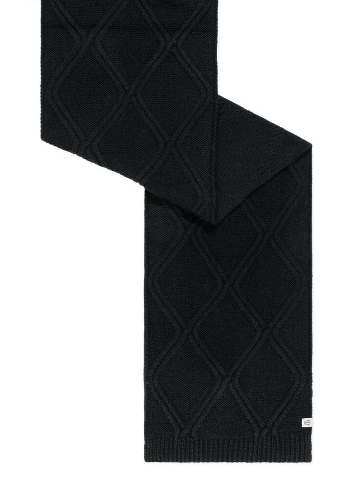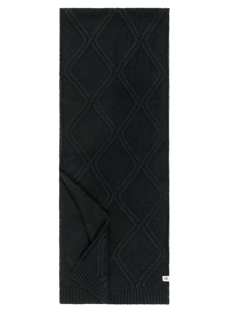 Vācu zīmola Roeckl adīta sieviešu šalle ar dekoratīvu rakstu melnā krāsā. Izgatavota no mīkstas 100% kašmira dzijas. Papildināta ar smalki rievotu apkšmalu apdari un kontrastējošu zīmola logotipa emblēmu.