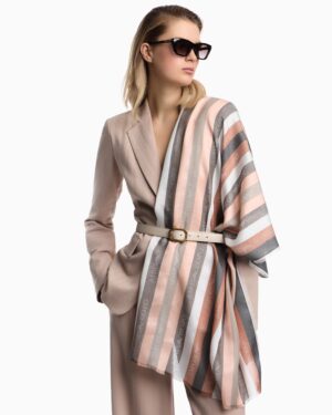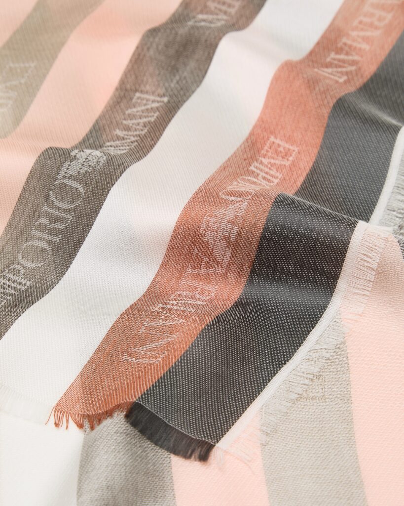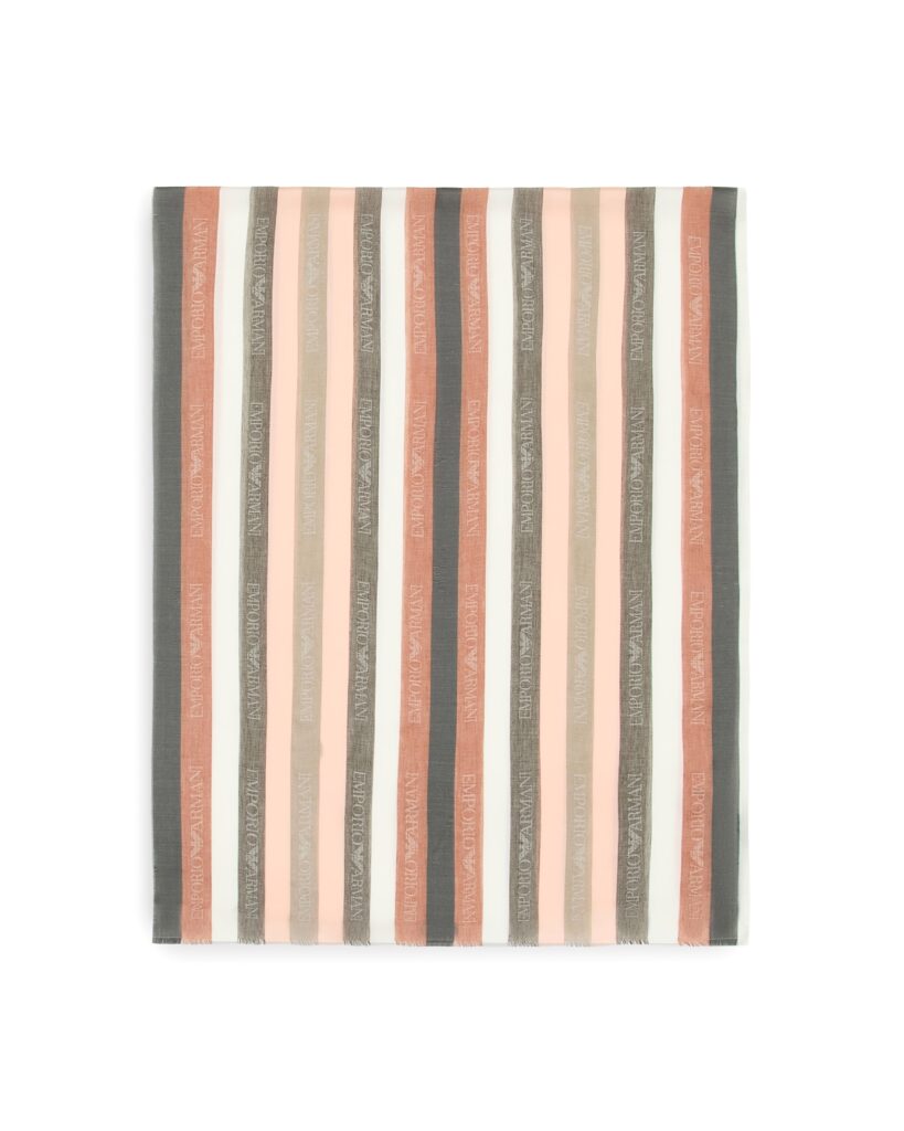 Itāļu luksusa zīmola Emporio Armani gaisīga sieviešu šalle ar svītru rakstu koraļļu rozā un silti pelēkos toņos. Izgatavota no Itālijā ražota smalka modāla maisījuma materiāla ar zīdainu tekstūru. Papildināta ar zīmola logotipa joslu rakstu un smalku bārkstiņu apdari nobeigumā.