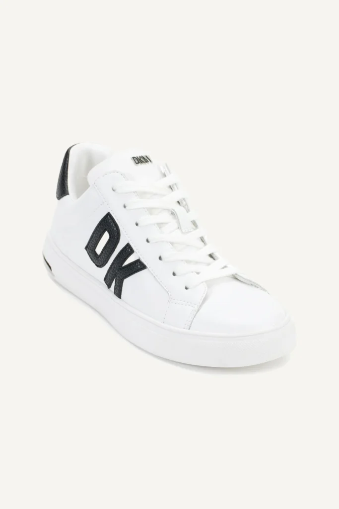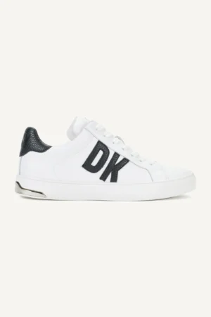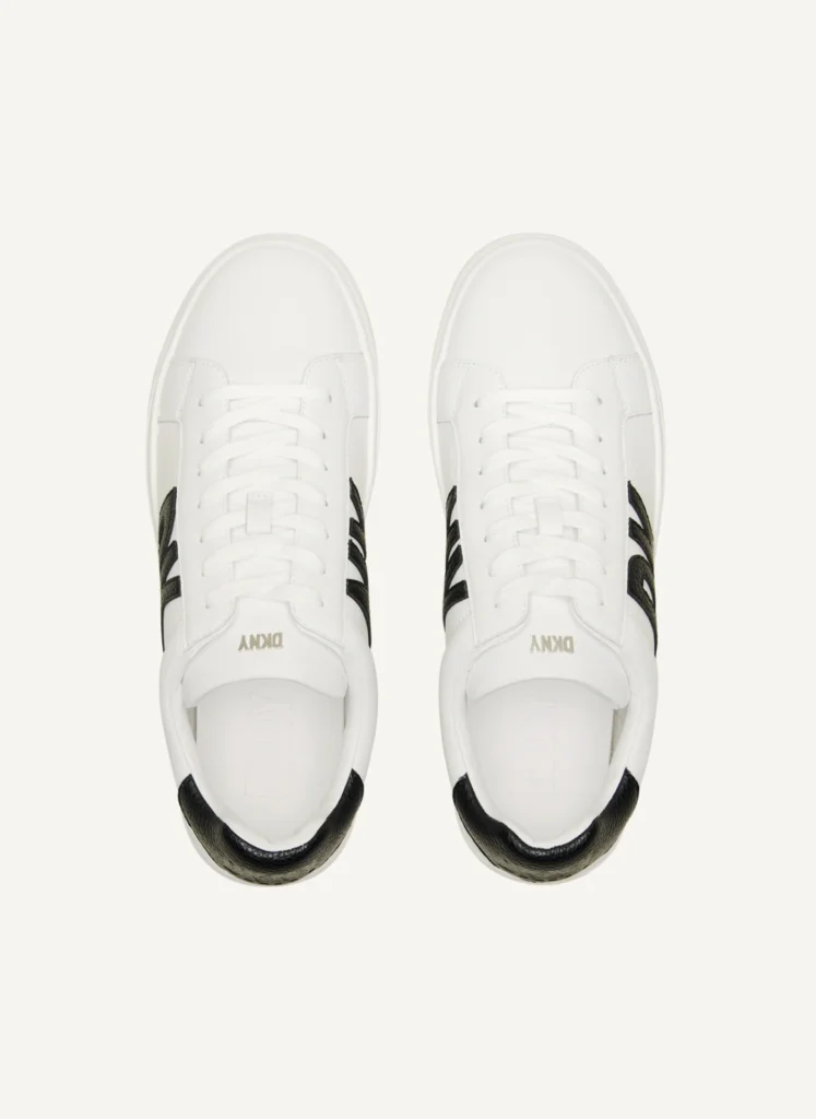ASV modes zīmola DKNY balti sieviešu brīva laika apavi jeb snīkeri ar zīmola logotipa un apdares detaļām melnā krāsā. Papildināti ar spožiem sudraba krāsas logo akcentiem. Virspusē izgatavoti no augstākās kvalitātes dabīgās ādas.