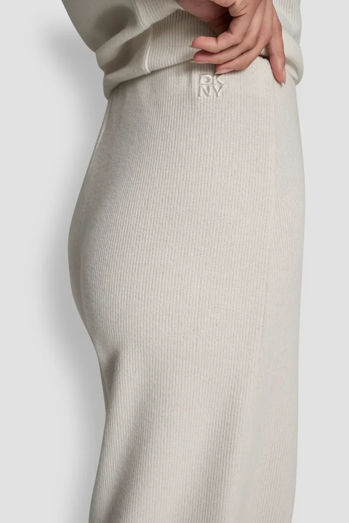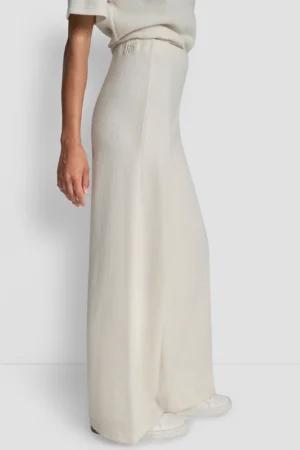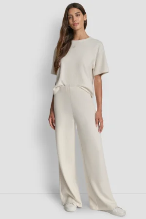 ASV modes zīmola DKNY plata piegriezuma sieviešu bikses gaiši bēšā krāsā. Izgatavotas no mīksta kokvilnas maisījuma trikotāžas materiāla ar smalki rievotu virspusi. Papildinātas ar augstu, elastīgu jostavietu un zīmola logotipa izšuvumu.