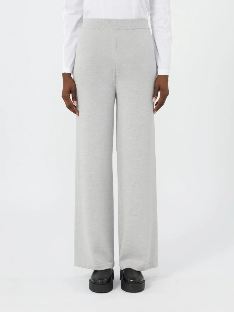 Ittāļu modes zīmola MM by Max Mara adītas sieviešu bikses gaiši pelēkā krāsā. Izgatavotas no blīvas un mīkstas jaunvilnas dzijas. Papildinātas ar elastīgu jostasvietu