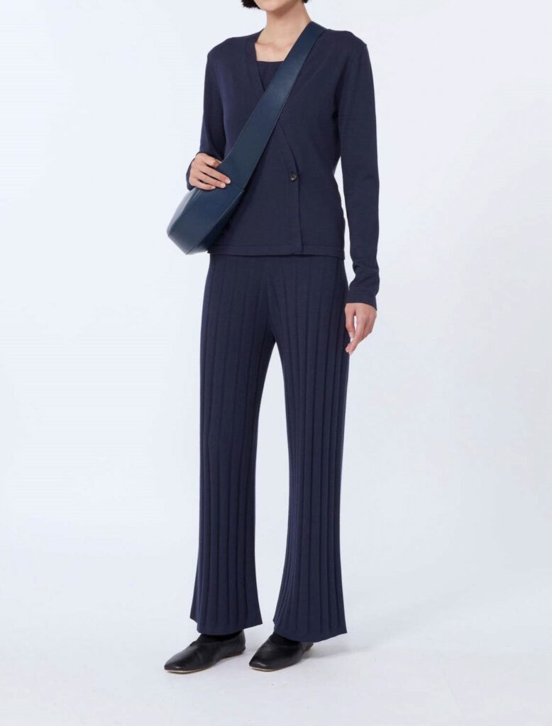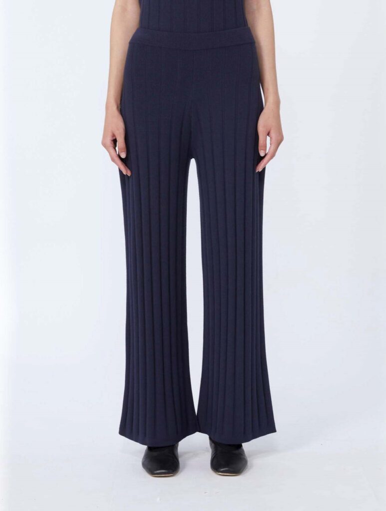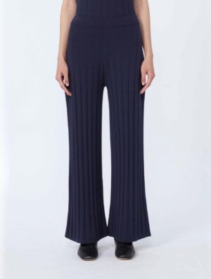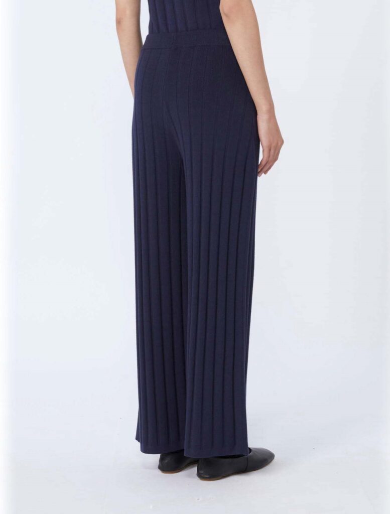Itāļu modes zīmola MM by Max Mara tumši zilas smalka, vertikāla adījuma sieviešu bikses no mīksta viskozes maisījuma materiāla. Papildinātas ar elastīgu jostasvietu.