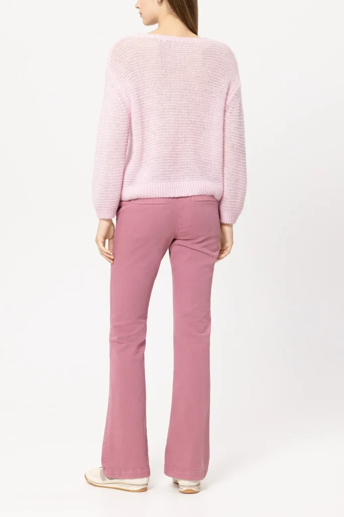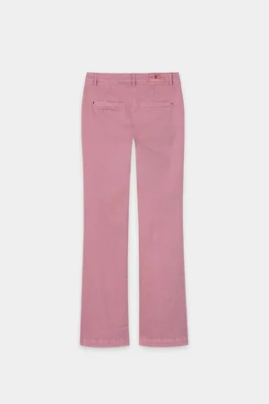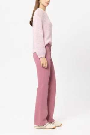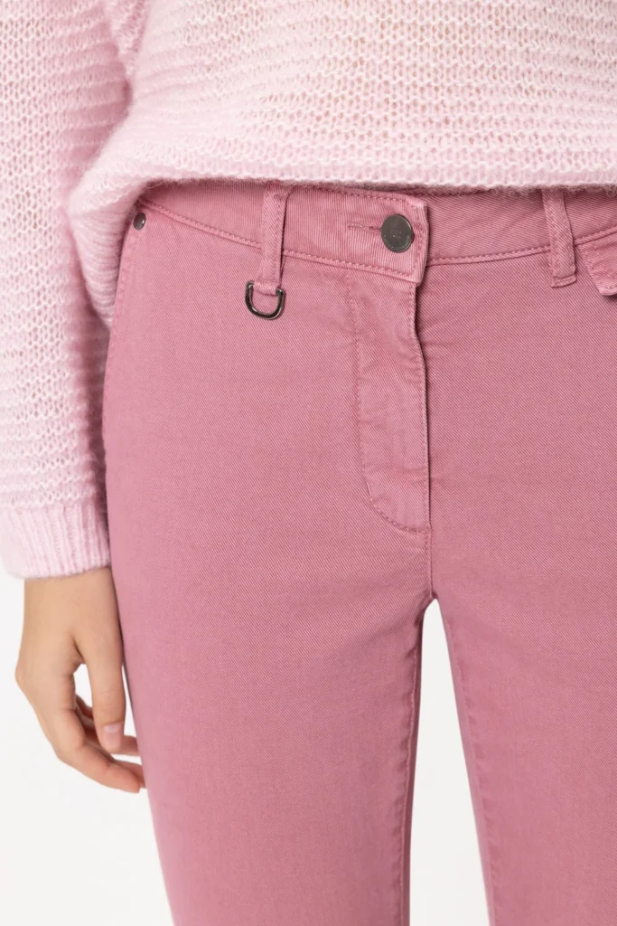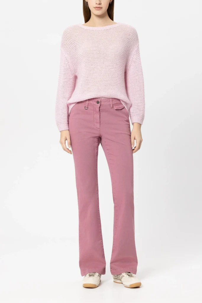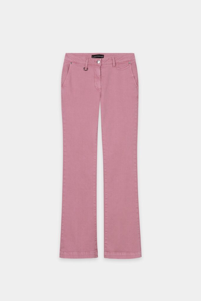 Vācu premium klases apģērbu zīmola Luisa Cerano paplatināta piegriezuma sieviešu džinsi dūmakaini rozā tonī. Izgatavoti no blīva un elastīga kokvilnas materiāla ar autentisku tekstūru. Akcentēti ar zelta krāsas gredzenu pie jostas cilpas un zīmola emblēmu mugurpusē.