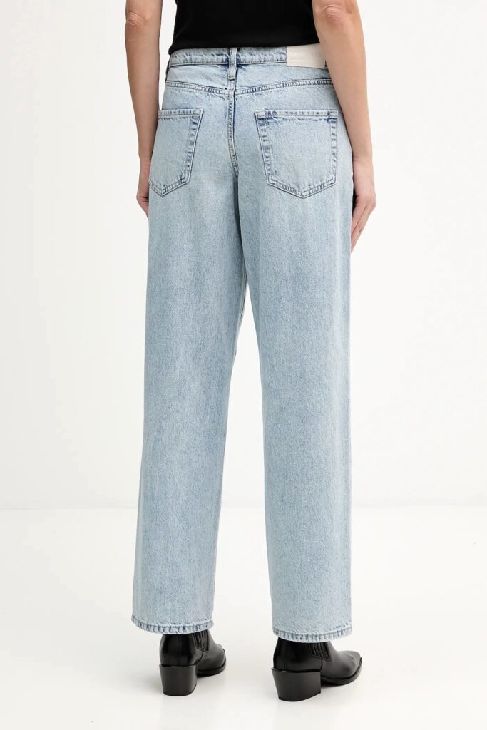 ASV modes zīmola DKNY gaiši zili taisna, brīva piegriezuma sieviešu džinsi ar balinājuma efektu. Izgatavoti no 100% kokvilnas. Papildināti ar vidēji augstu jostasvietu un zīmola logotipa detaļām.