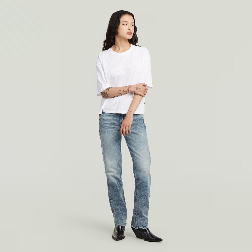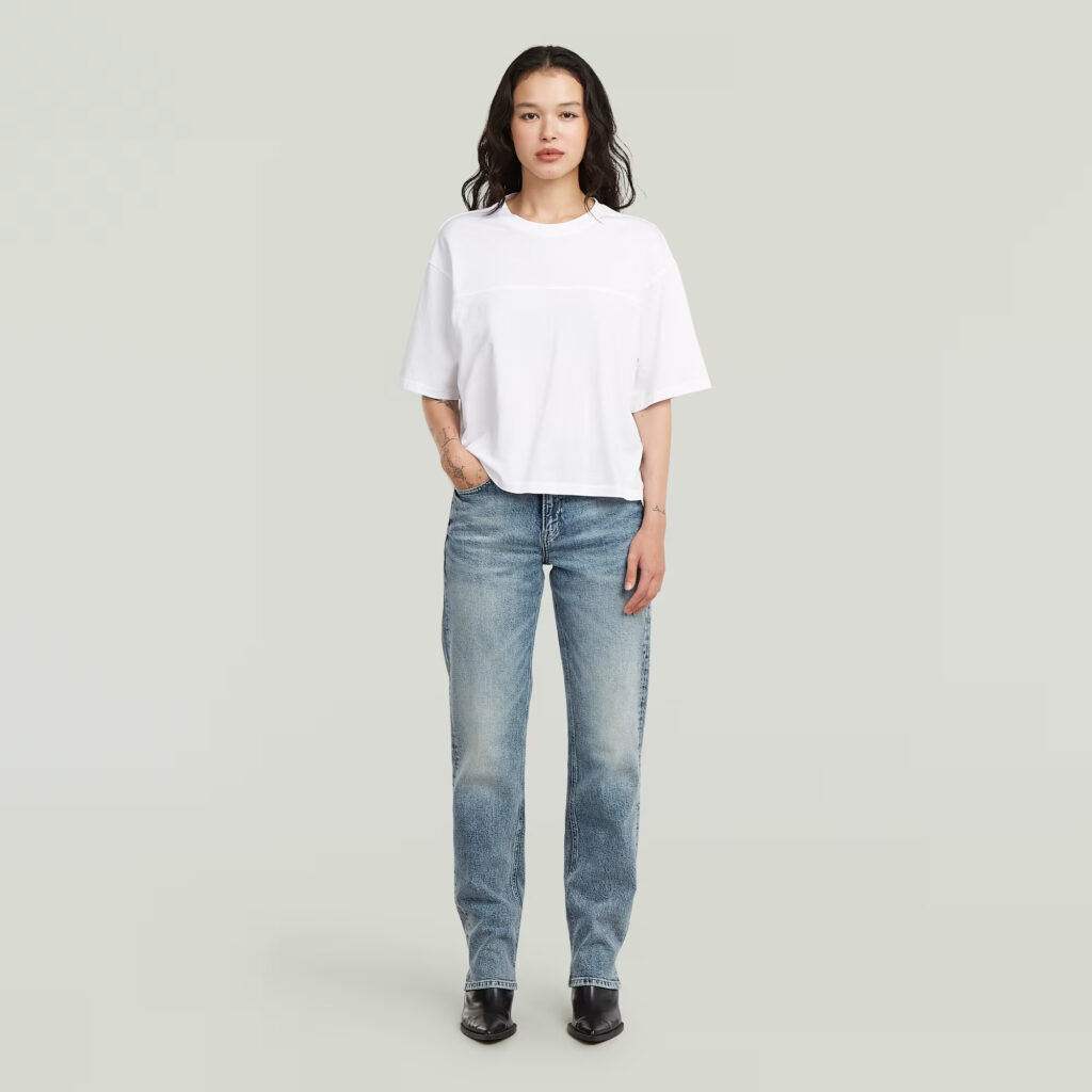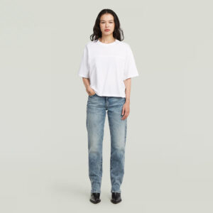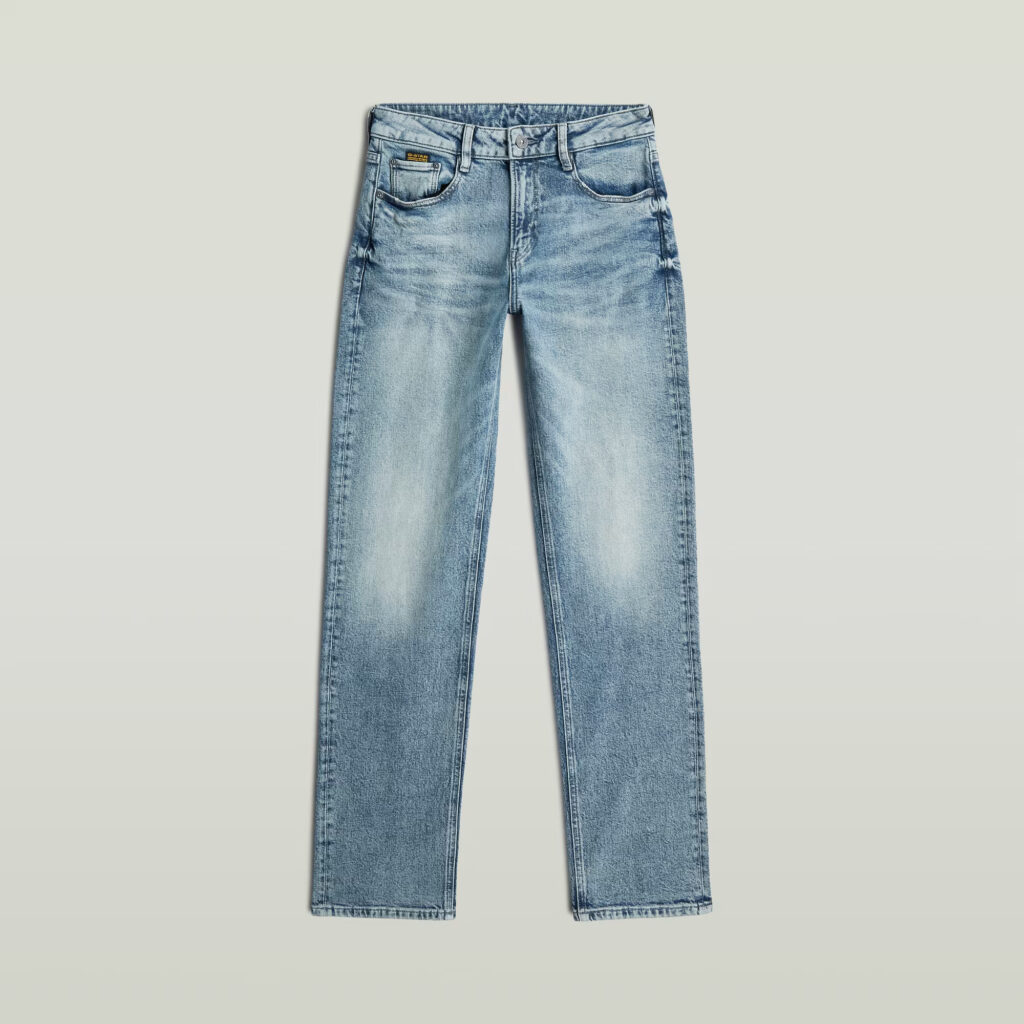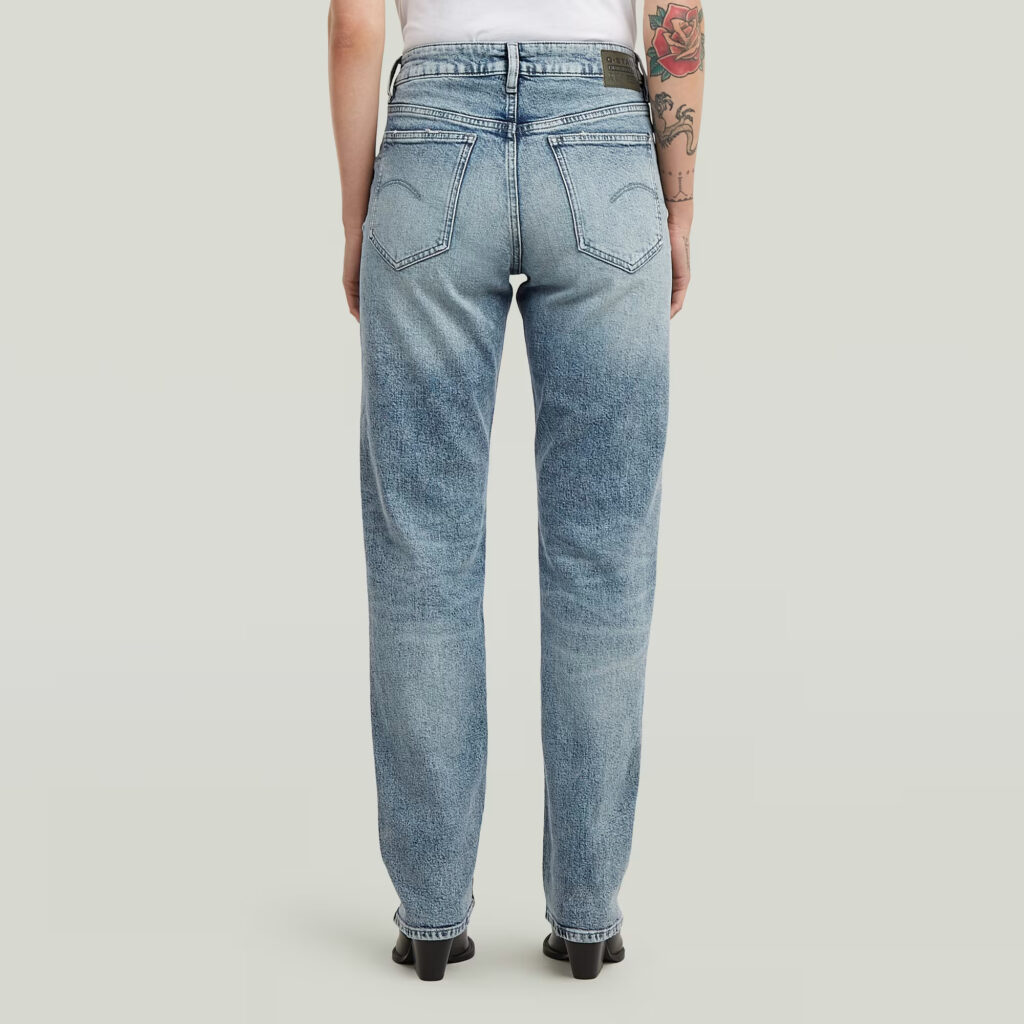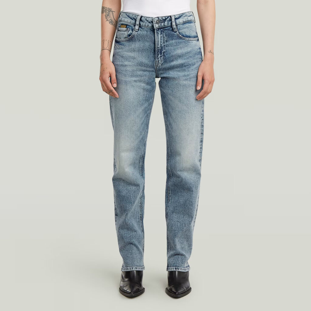 Nīderlandes zīmola G-Star Raw zili taisna piegriezuma sieviešu džinsi ar izbalojuma efektu. Izgatavoti no viegli elastīga un pārstrādāta kokvilnas materiāla. Papildināti ar vidēji augstu, labi pieguļošu jostasvietu. Akcentēti ar zīmola logotipa detaļām.