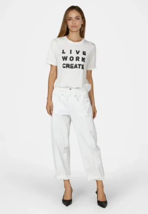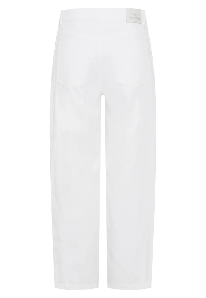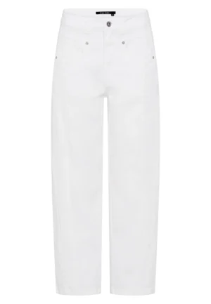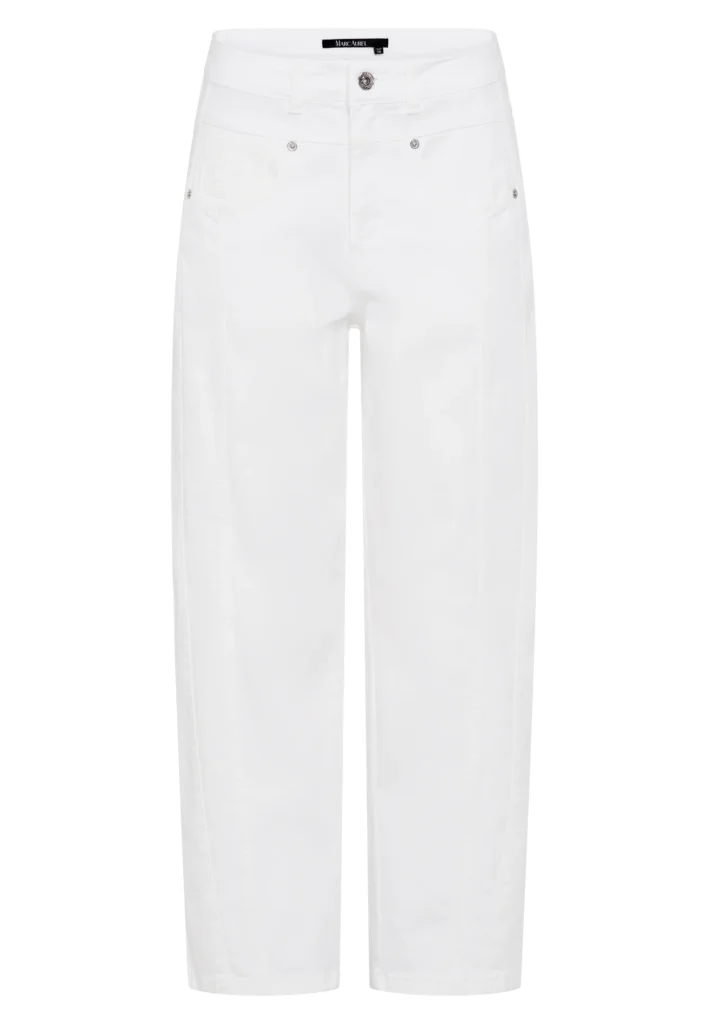 Vācu modes zīmola Marc Aurel balti mucveida piegriezuma sieviešu džinsi ar augstu jostasvietu. Izgatavoti no viegli elastīga kokvilnas materiāla. Akcentēti ar izsmalcinātu vientoņa izšuvumu pie kabatas, kā arī sudraba krāsas metāla un zīmola logotipa detaļām.