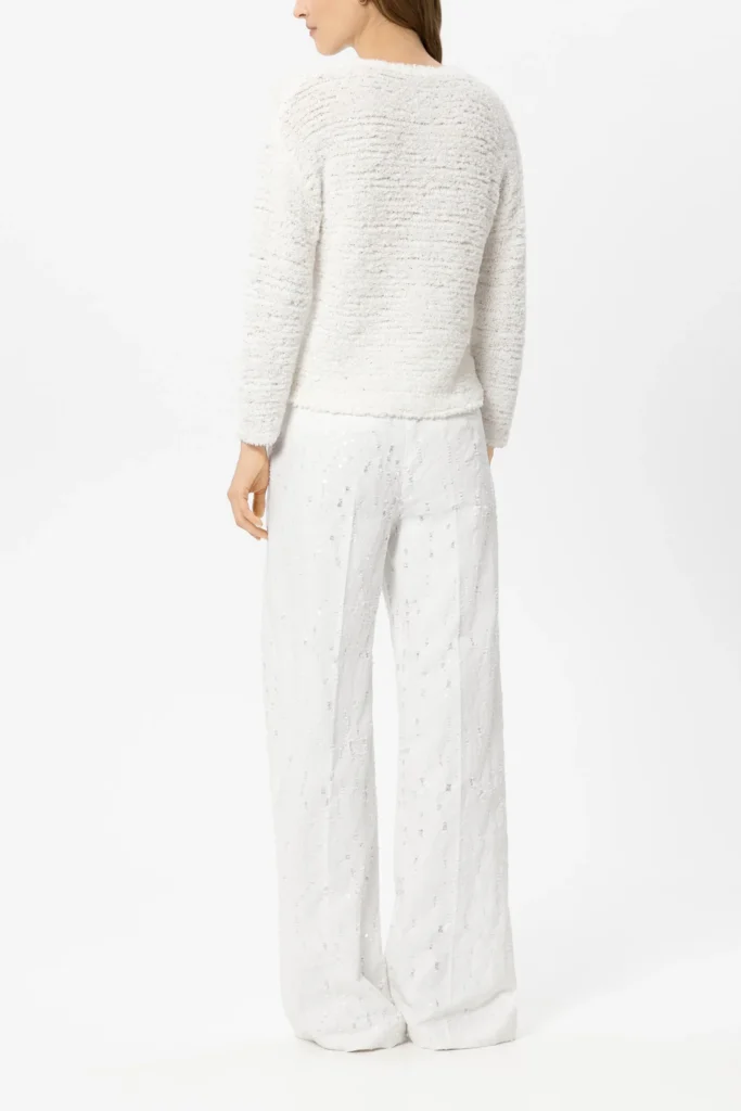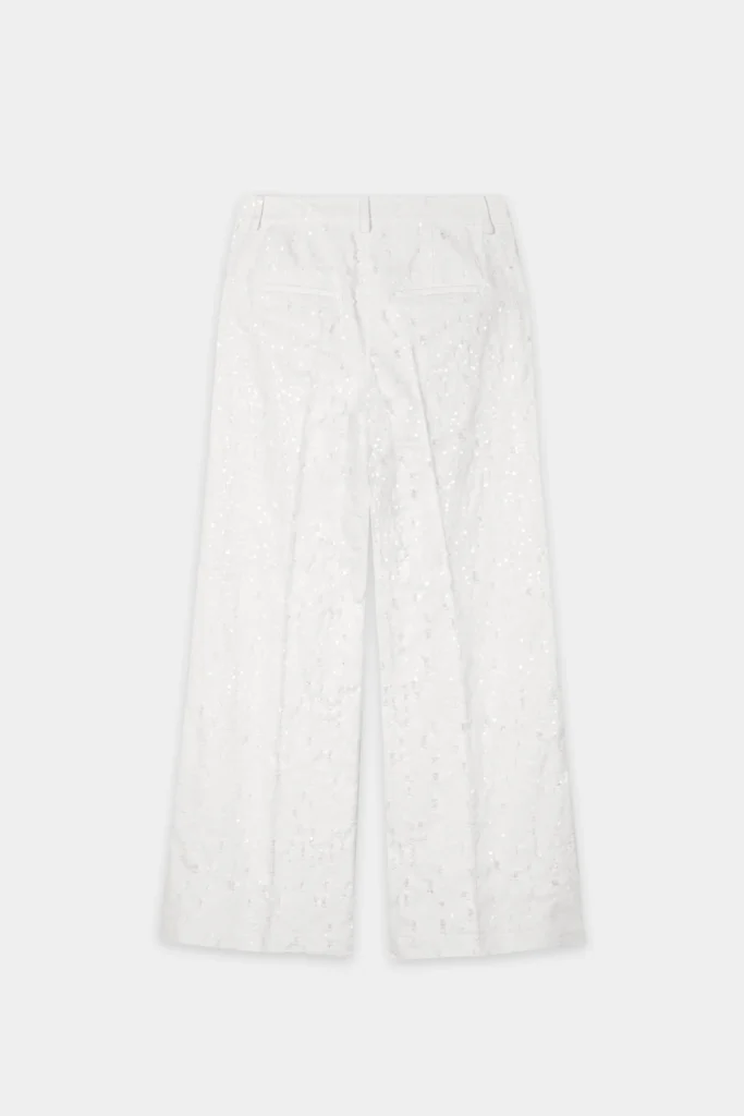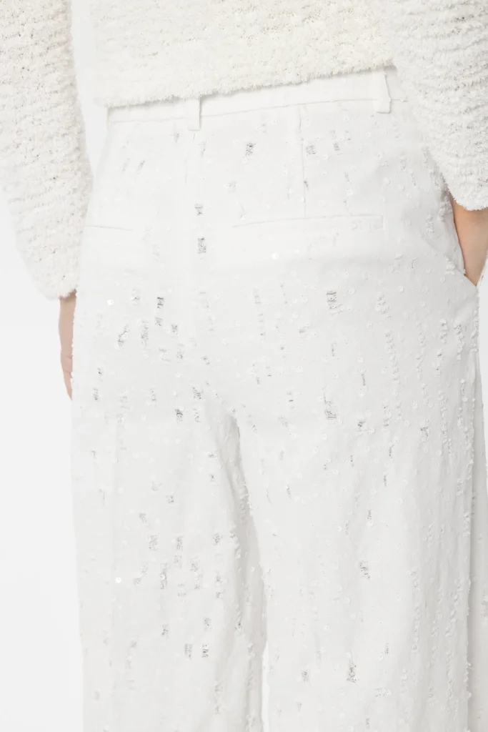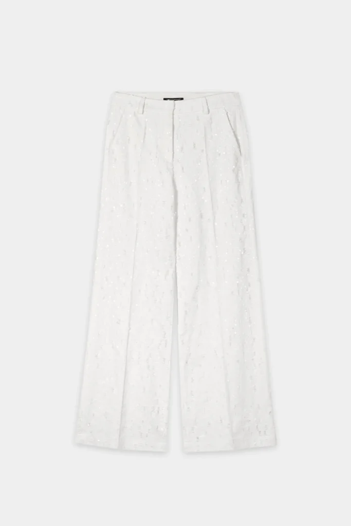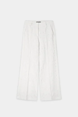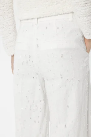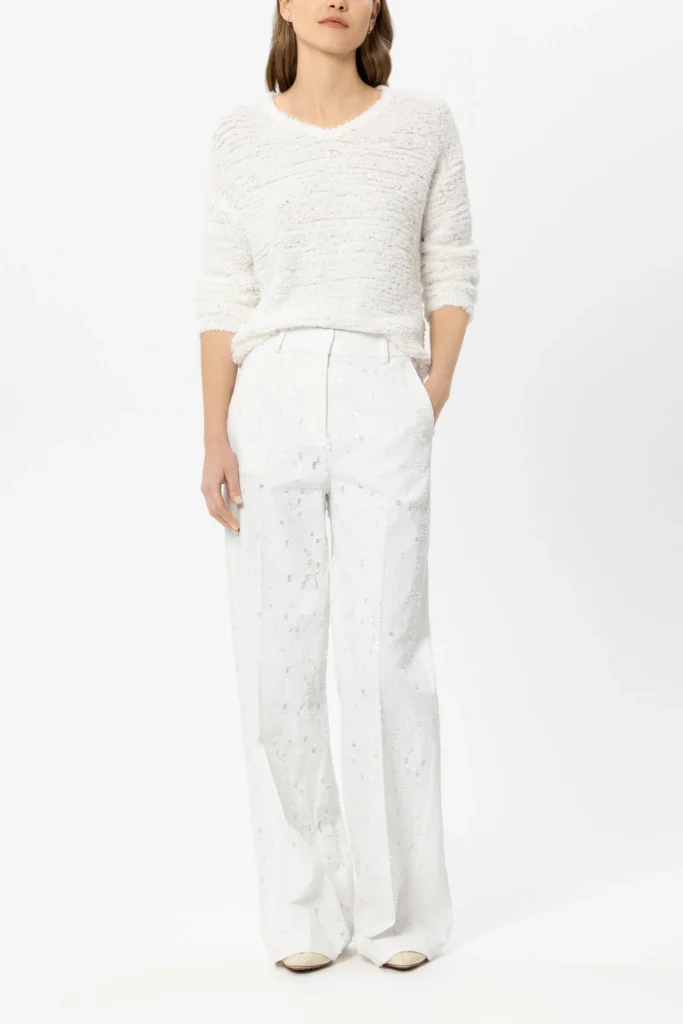 Vācu premium klases apģērbu zīmola Luisa Cerano baltas plata piegriezuma sieviešu bikses ar smalku plēsumu detaļām. Izgatavotas no 100% kokvilnas materiāla ar džinsveida struktūru. Akcentētas ar balti zaigojošu fliteru izšuvumiem.