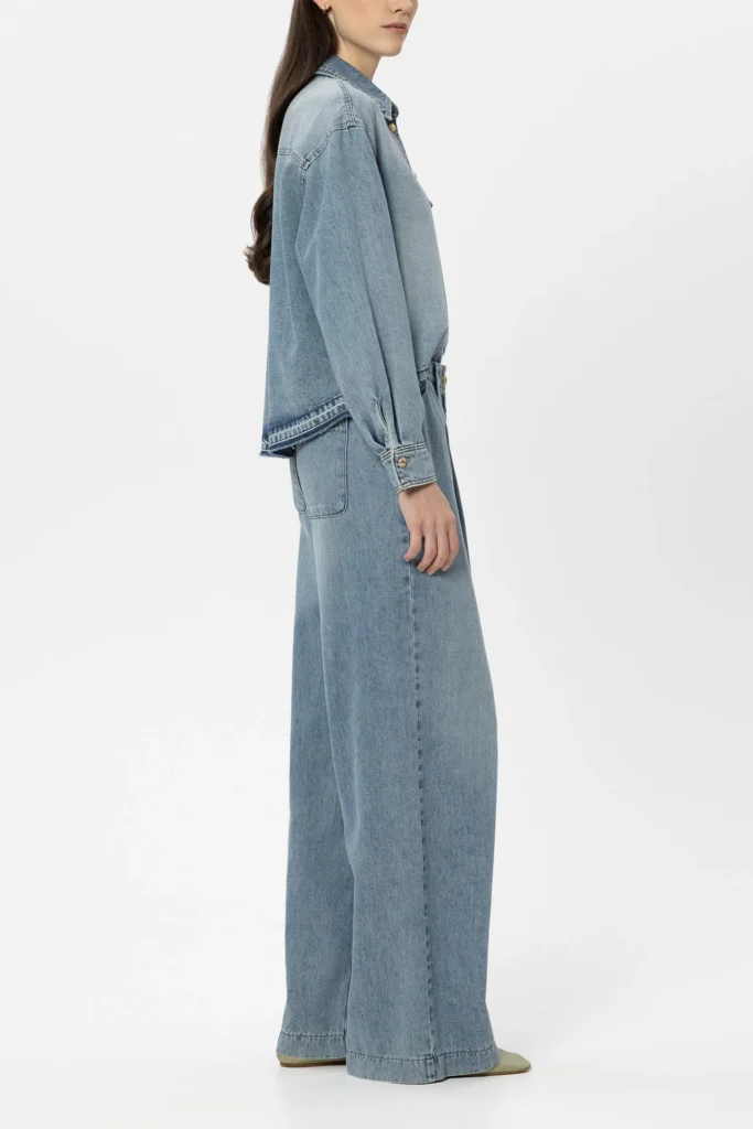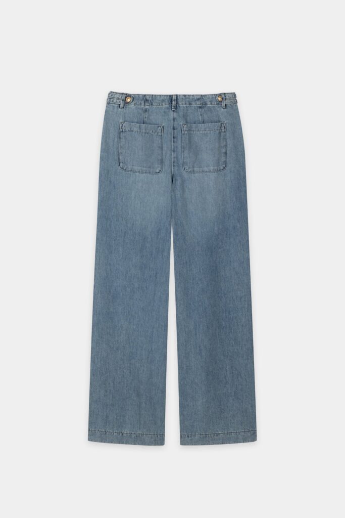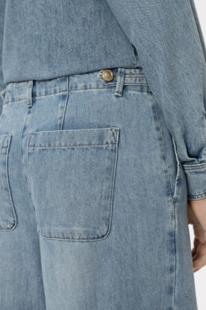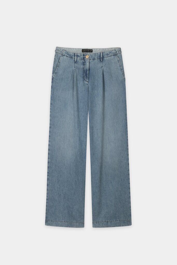 Vācu premium klases apģērbu zīmola Luisa Cerano zilas plata piegriezuma džinsu bikses sievietēm. Izgatavotas no mīksta kokvilnas un liocela materiāla ar izbalojuma efektu. Papildinātas ar ielocēm un sānos regulējamu jostu. Akcentētas ar zeltainu metāla pogu aizdari.