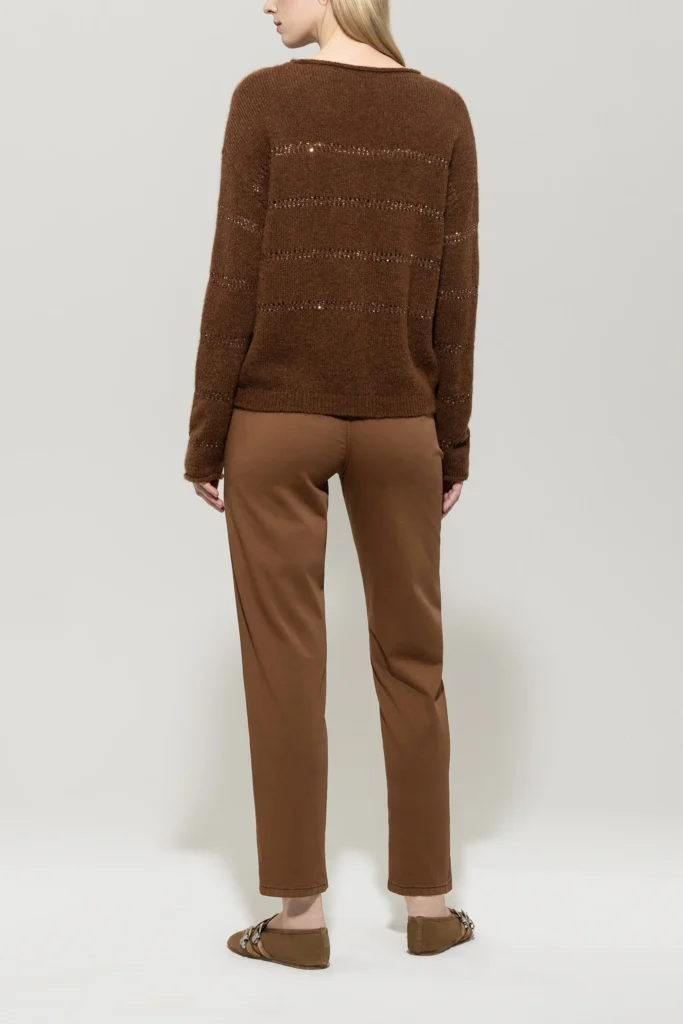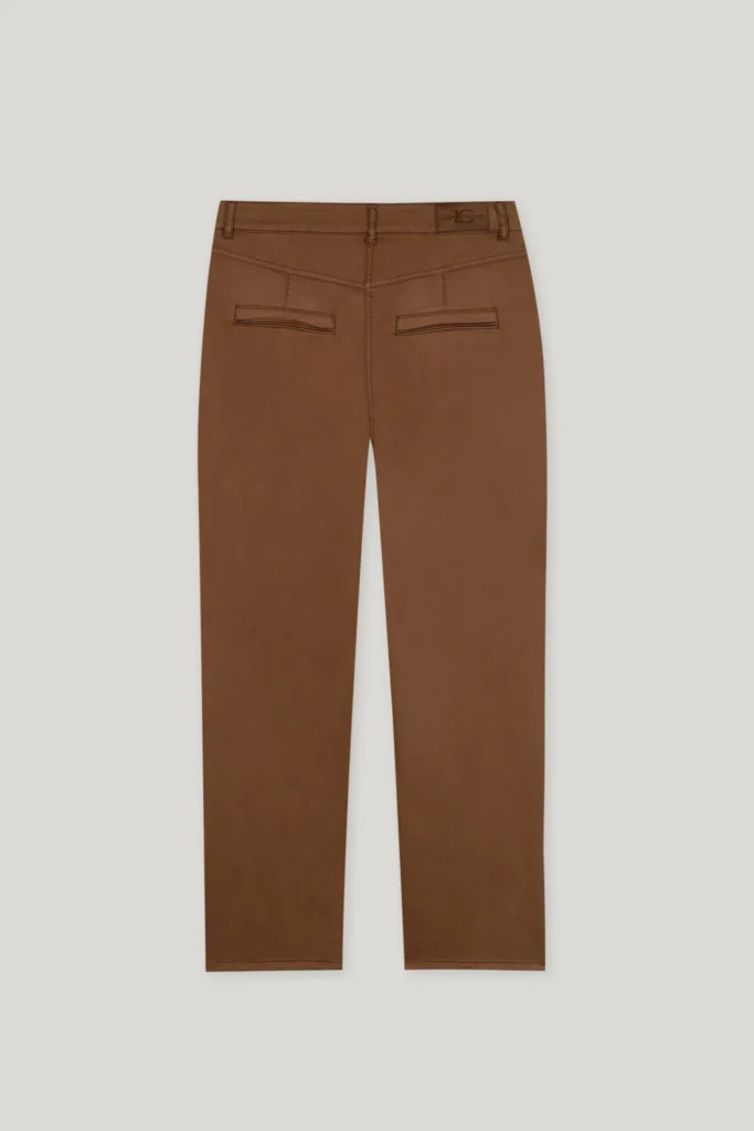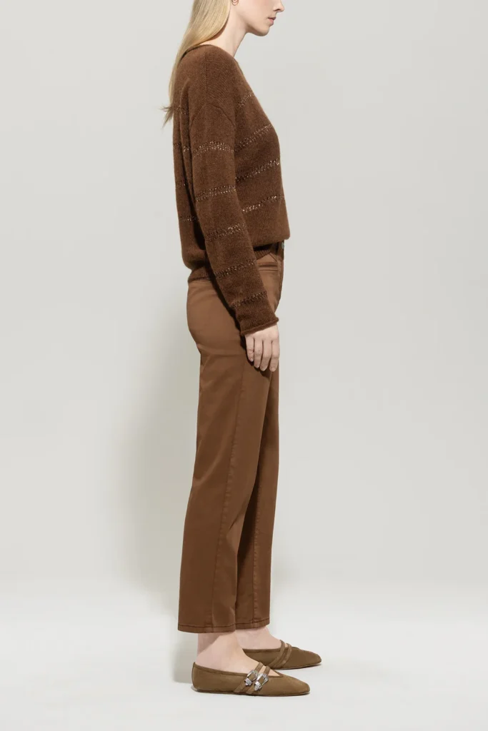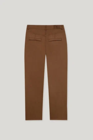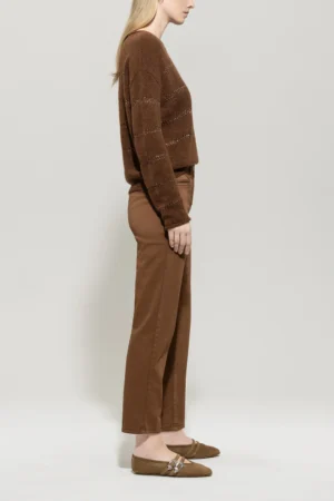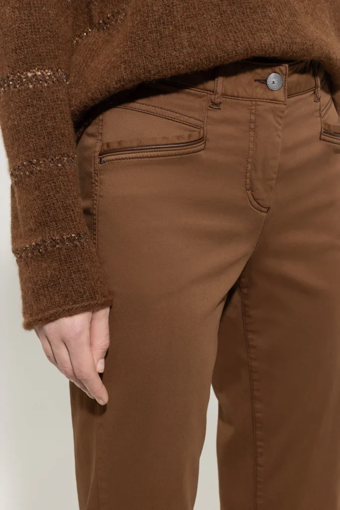 Vācu premium klases apģērbu zīmola Luisa Cerano pakāpeniski sašaurinātas džinsu bikses zeltaini brūnā krāsā. Izgatavotas no elastīga kokvilnas materiāla. Papildinātas ar dekoratīvām ādas apdares detaļām un zīmola emblēmu mugurpusē.