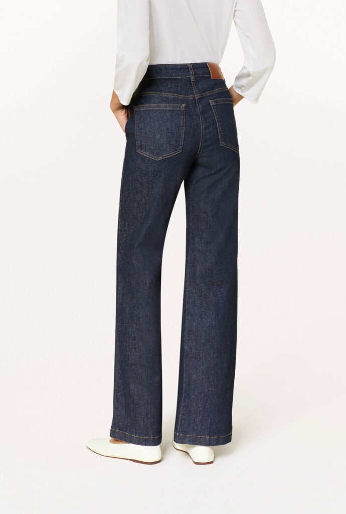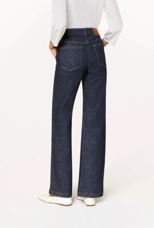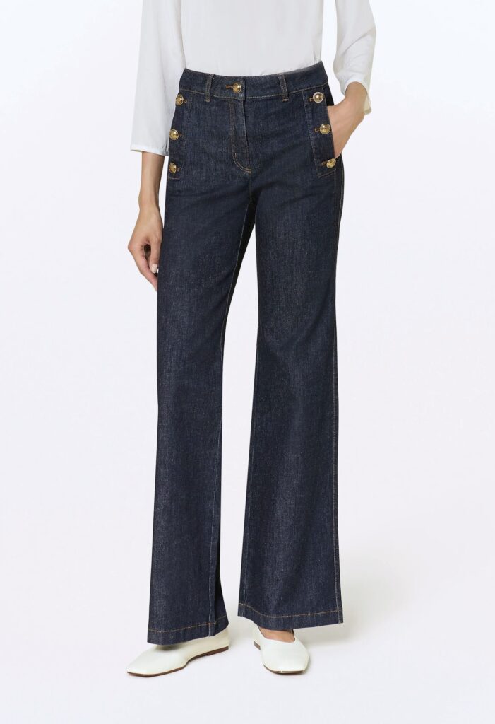 Vācu premium klases apģērbu zīmola Luisa Cerano tumši zilas paplatināta piegriezuma džinsu bikses sievietēm. Izgatavotas no elastīga kokvilnas materiāla. Akcentētas ar zīmola metāla pogām uz sānu kabatām un logo emblēmu mugurpusē.