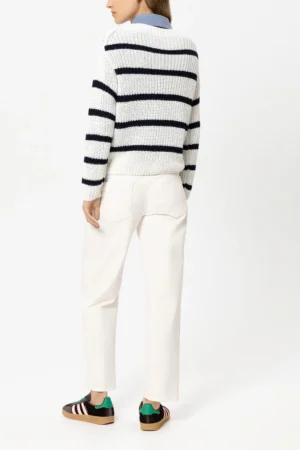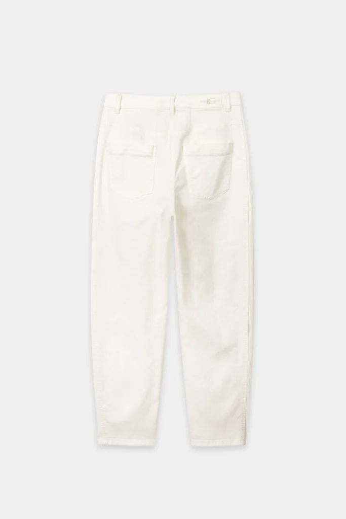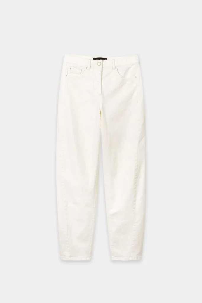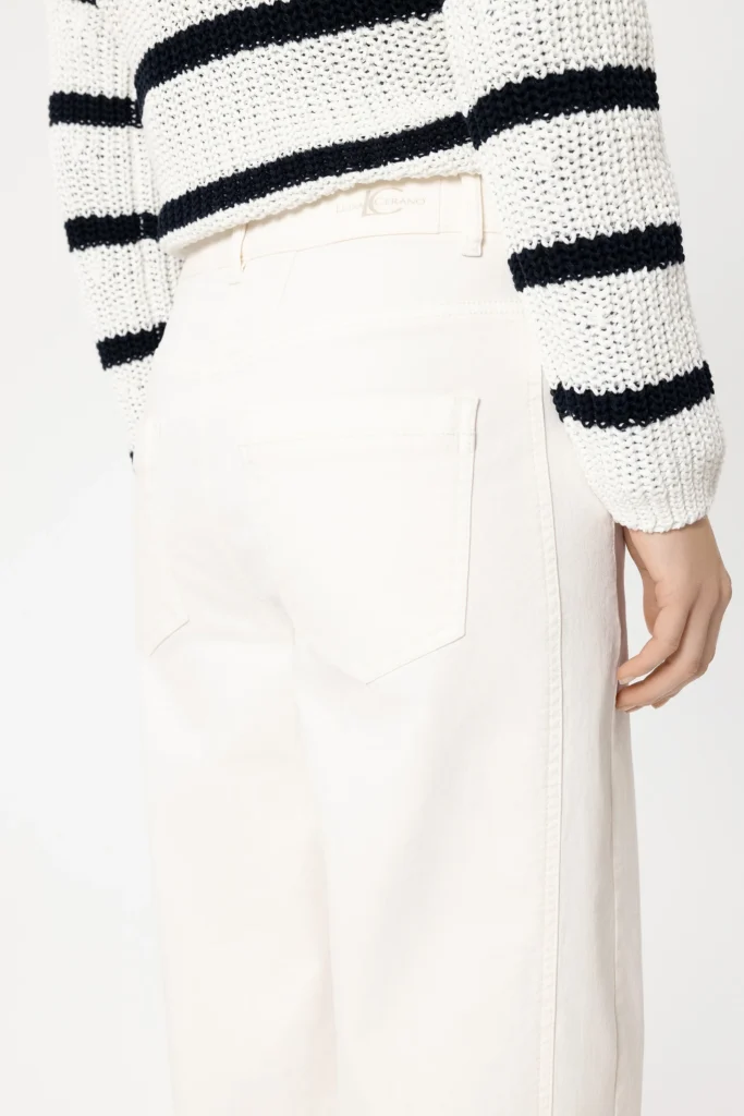 Vācu premium klases apģērbu zīmola Luisa Cerano viegli saīsināti brīva, noapaļota piegriezuma sieviešu džinsi gaišā, krēmīgi bēšā krāsā. Izgatavoti no blīva un elastīga kokvilnas materiāla ar autentisku tekstūru. Akcentēti ar zīmola emblēmu mugurpusē.