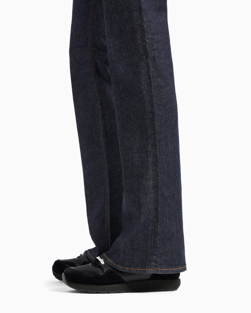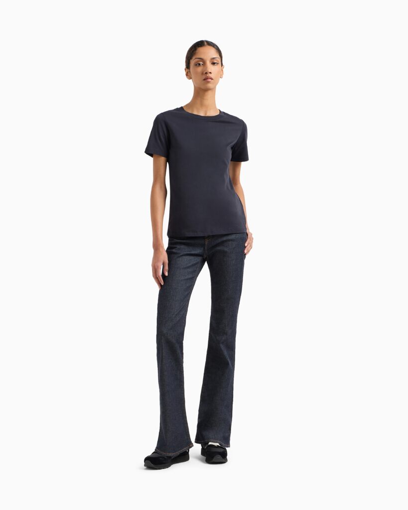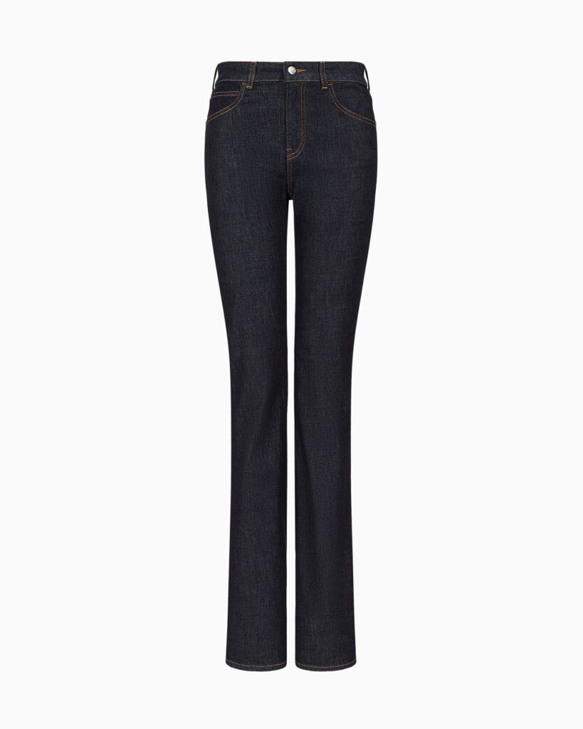 Itāļu luksusa zīmola Emporio Armani pieguļošas sieviešu džinsu bikses tumši zilā krāsā. Izgatavotas no viegli elastīga kokvilnas materiāla. Papildinātas ar kontrastējošām dekoratīvajām nošuvēm, paplatinātiem bikšu galiem un zīmola logotipa akcentiem.