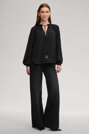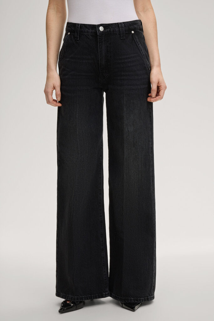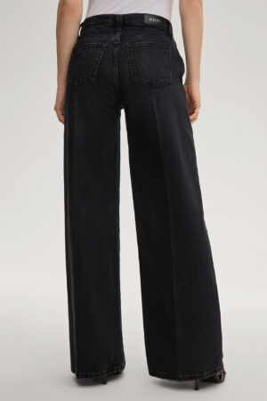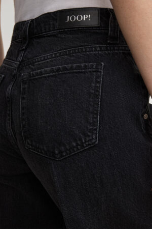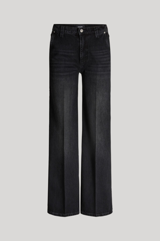 Vācu modes zīmola Joop! melni plata piegriezuma sieviešu džinsi ar nelielu nobružājuma efektu. Izgatavoti no 100% bio kokvilnas. Papildināti ar nedaudz paaugstinātu jostasvietu un zīmola logotipa akcentiem.