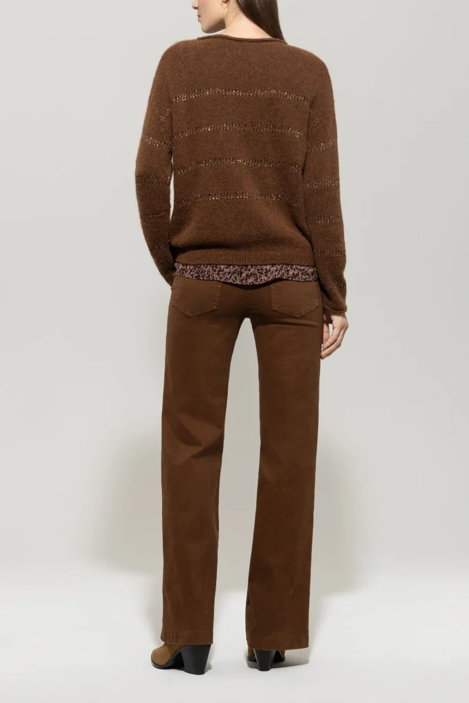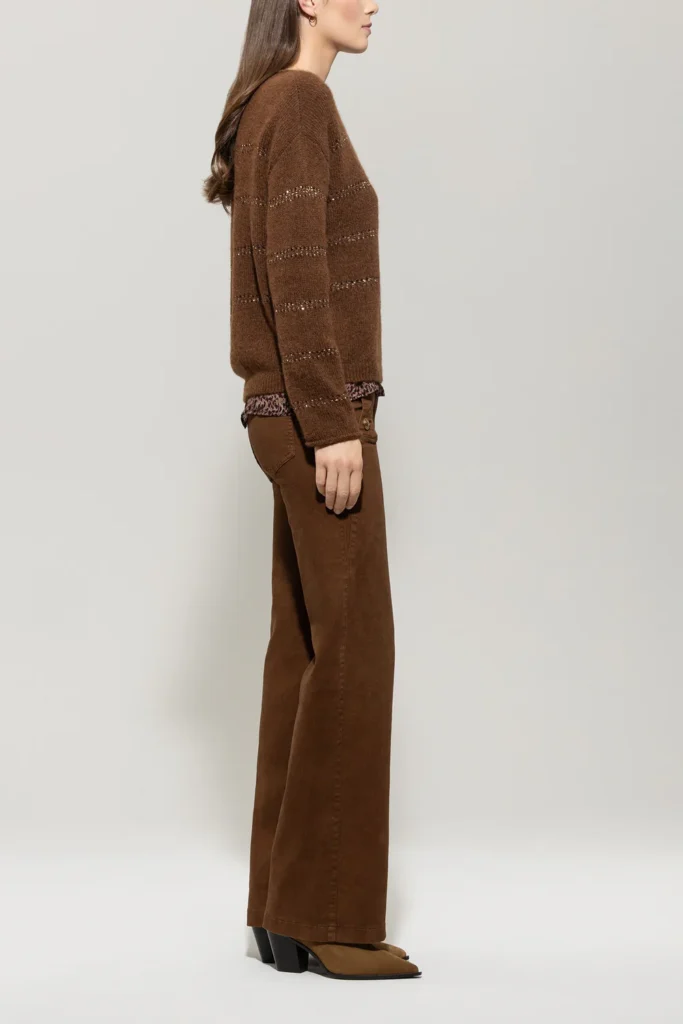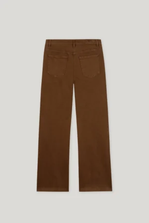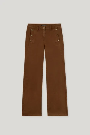Vācu premium klases apģērbu zīmola Luisa Cerano zeltaini brūnas paplatināta piegriezuma džinsu bikses sievietēm. Izgatavotas no autentiska kokvilnas tvīda auduma ar vintage stila krāsojumu. Akcentētas ar zīmola metāla pogām uz sānu kabatām un logo emblēmu mugurpusē.