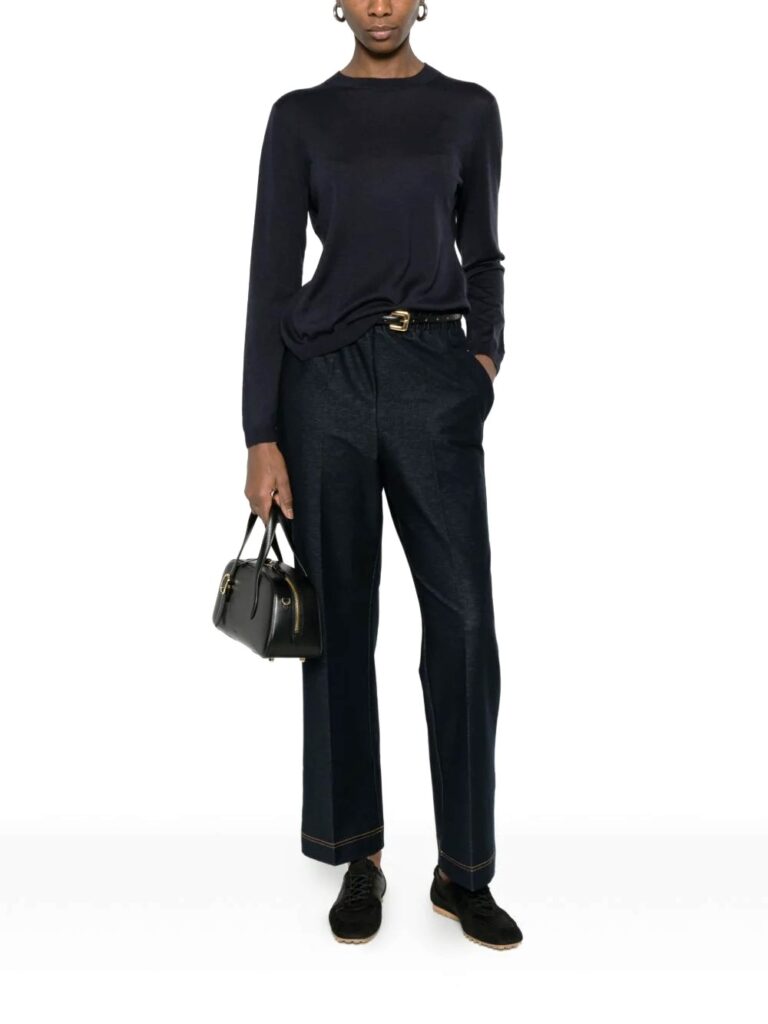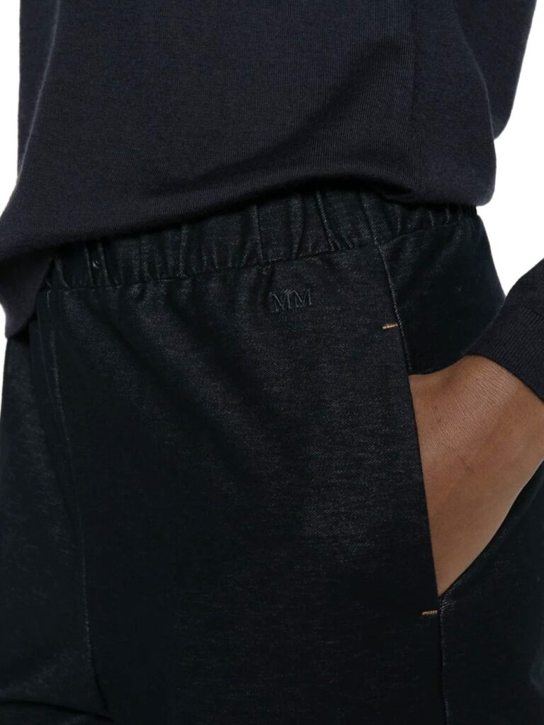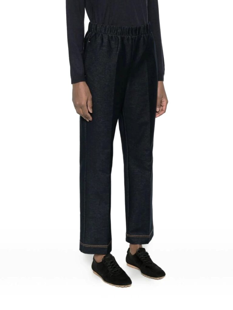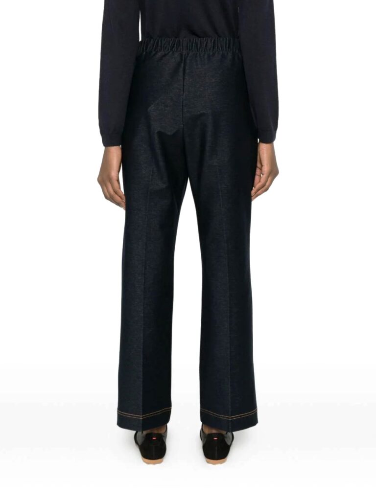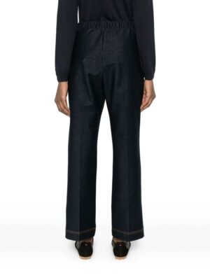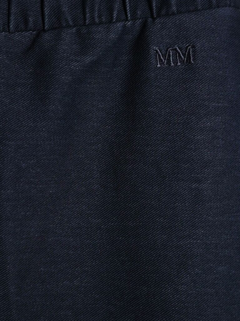 Itāļu modes zīmola MM by Max Mara tumši zilas taisna piegriezuma sieviešu bikses ar elastīgu jostasvietu. Izgatavotas no blīva un elastīga kokvilnas maisījuma materiāla ar džinsveida struktūru. Akcentētas ar kontrastējošām dekoratīvajām nošuvēm un vientoņa logo izšuvumu pie kabatas.