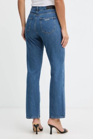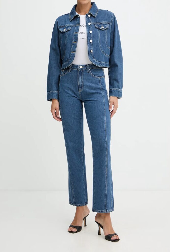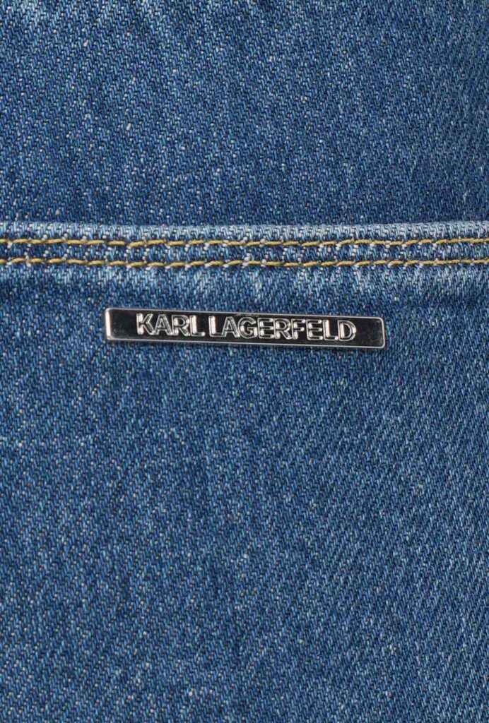 Vācu luksusa zīmola Karl Lagerfeld taisna piegriezuma sieviešu džinsi zilā krāsā. Izgatavoti no 100% kokvilnas. Akcentēti ar paralēlām vertikālajām nošuvēm kontrastējošā tonī un smalku sudraba krāsas metāla emblēmu uz kabatas mugurpusē.