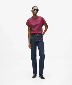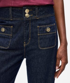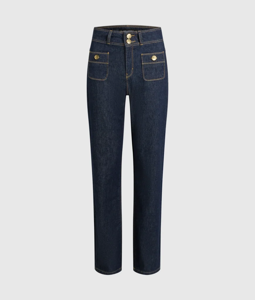 Vācu luksusa zīmola Karl Lagerfeld tumši zili taisna piegriezuma sieviešu džinsi ar kontrastējošiem akcentiem. Izgatavoti no 100% kokvilnas. Papildināti ar uzšūtām kabatām, kā arī zelta krāsas monogrammas pogām un dekoratīvām nošuvēm.