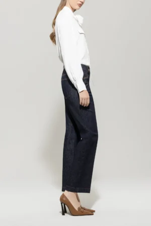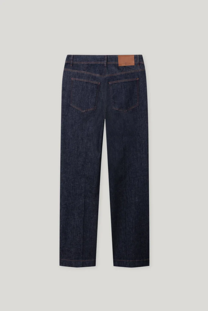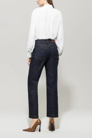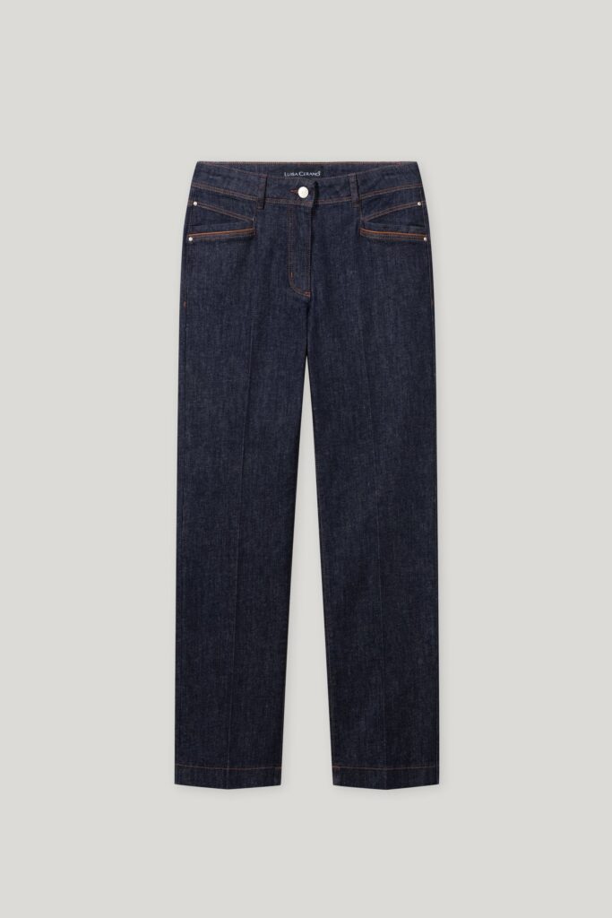 Vācu premium klases apģērbu zīmola Luisa Cerano tumši zilas taisna piegriezuma džinsu bikses sievietēm. Izgatavotas no elastīgas kokvilnas. Papildinātas ar kontrastējošām nošuvēm, ādas apdares detaļām un zīmola emblēmu mugurpusē.