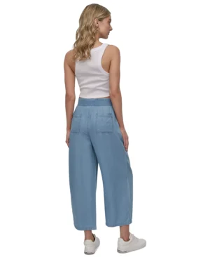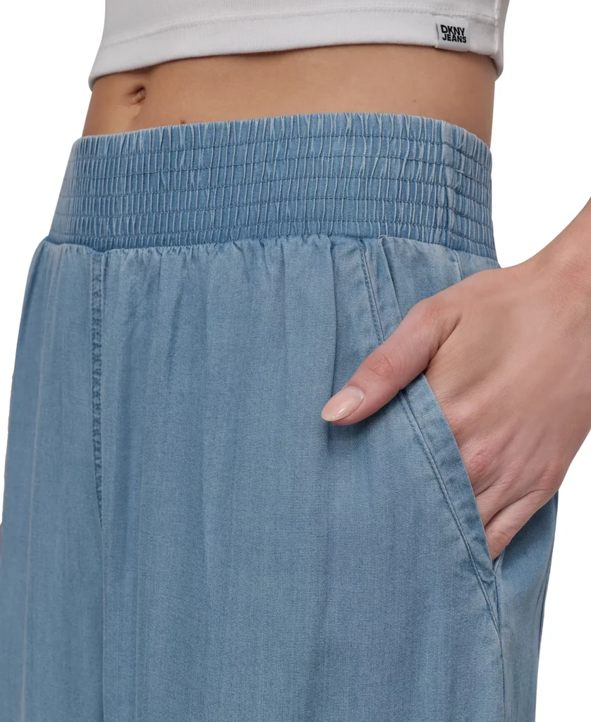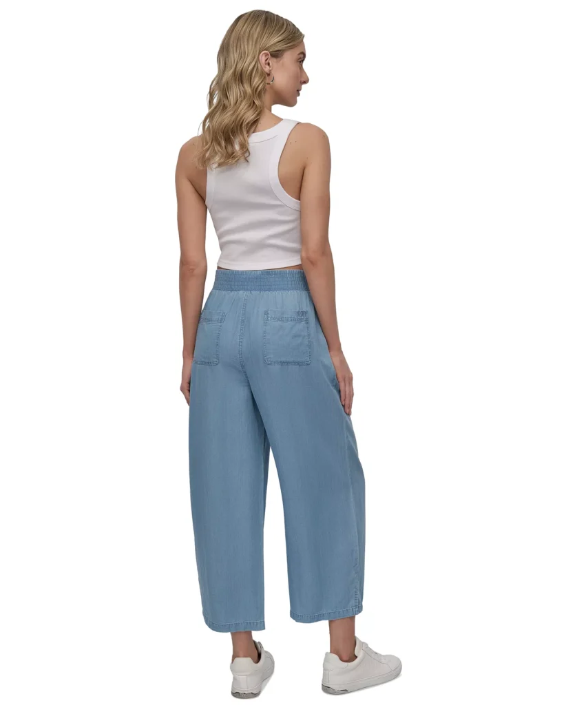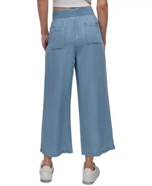 ASV modes zīmola DKNY gaiši zilas plata piegriezuma bikses sievietēm. Izgatavotas no viegla un plūstoša džinsveida tencel auduma. Papildinātas ar elastīgu jostasvietu un nelieliem šķēlumiem apakšmalās. Akcentētas ar zīmola vientoņa izšuvumu uz kabatas mugurpusē.
