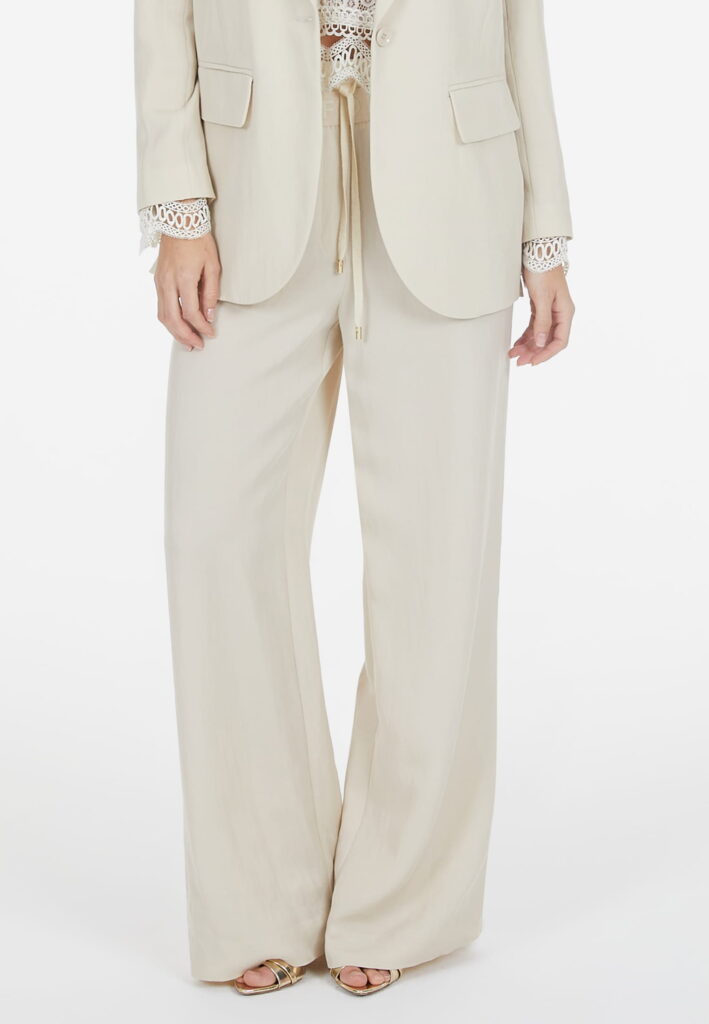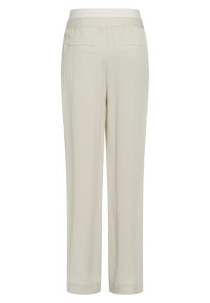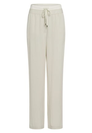 Vācu modes zīmola Marc Aurel ērtas un stilīgas brīva piegriezuma sieviešu bikses gaiši pelēkbēšā krāsā. Izgatavotas no mīksta viskozes maisījuma tvilla auduma. Papildinātas ar elastīgu un sasienamu dubulto jostasvietu, kā arī iešūtām sānu kabatām.