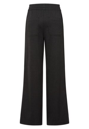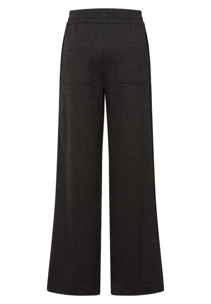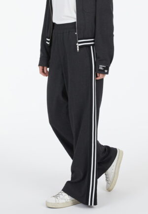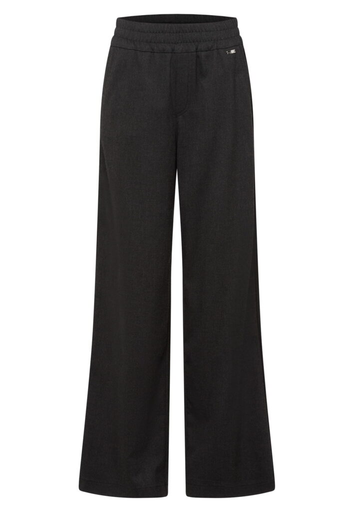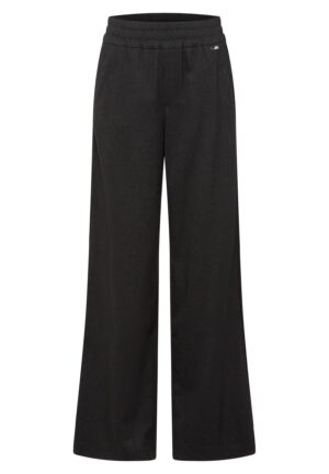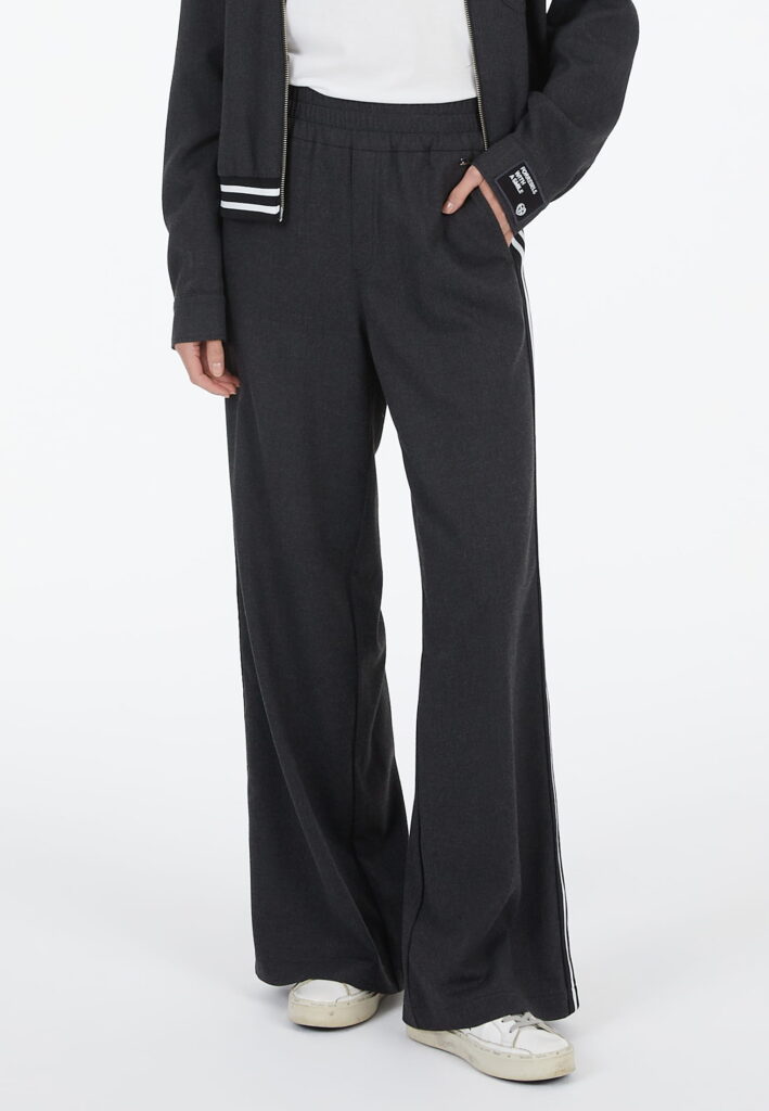 Vācu modes zīmola Marc Aurel universālas plata piegriezuma sieviešu bikses ar elastīgu jostu tumši pelēkā, gandrīz melnā krāsā. Izgatavotas no mīksta viskozes maisījuma materiāla ar vilnas struktūru. Akcentētas ar baltām sānu svītrām un zīmola metāla emblēmu pie jostas.