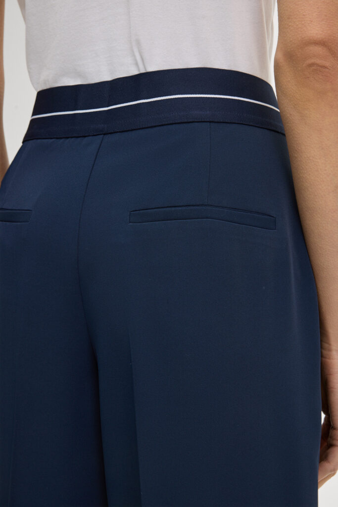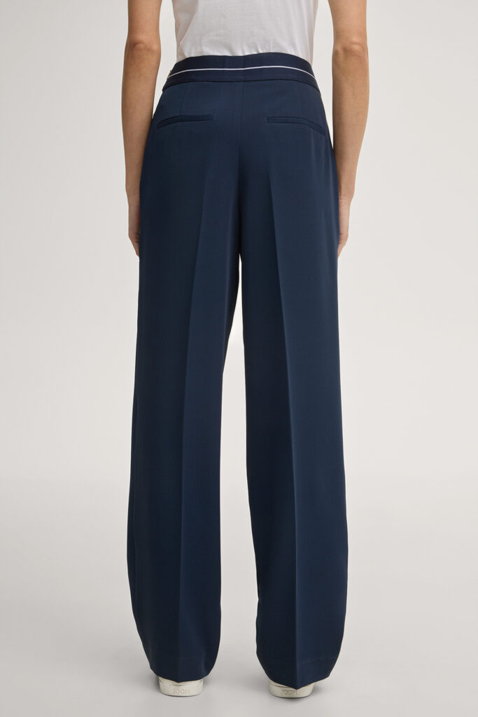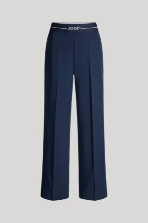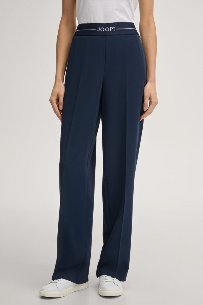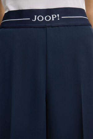 Vācu modes zīmola Joop! universālas sieviešu bikses tumši zilā krāsā. Izgatavotas no viegla un plūstoša poliestera auduma. Papildinātas ar elastīgu un kontrastējošu logo dizaina jostu, kā arī rāvējslēdzēja aizdari sānā.