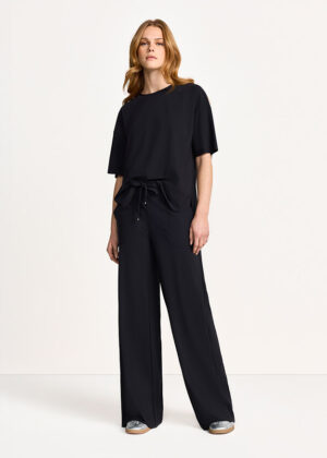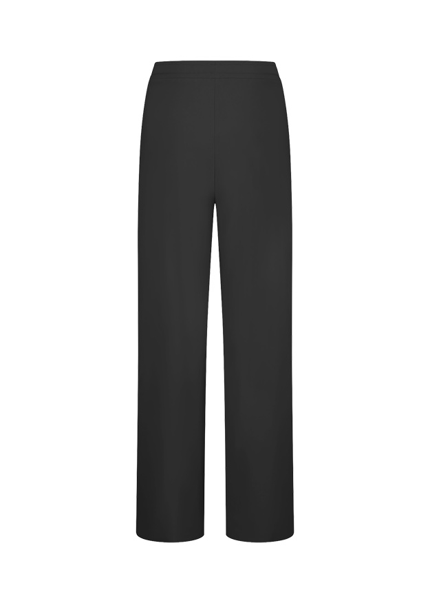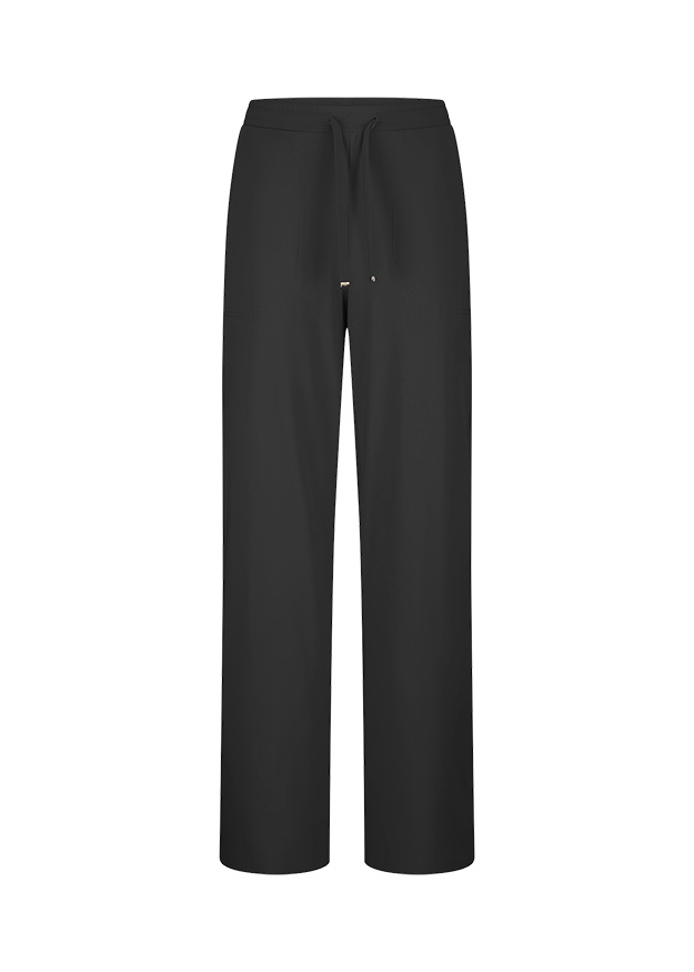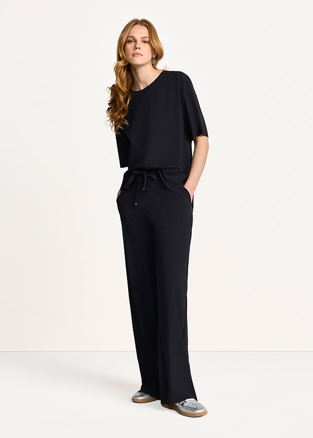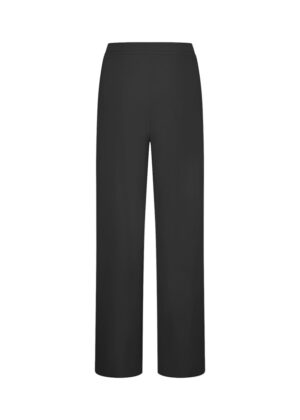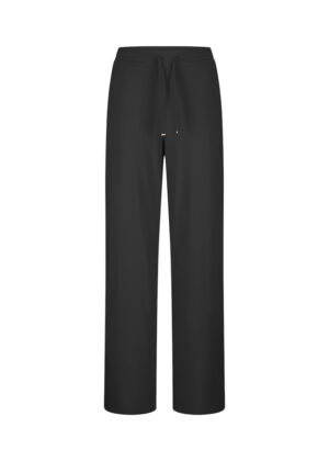 Vācu modes zīmola Riani melnas taisna, plata piegriezuma sieviešu bikses ar sasienamu jostasvietu. Izgatavotas no elastīga, neburzīga un ātri žūstoša inovatīvā materiāla. Papildinātas ar uzšūtām sānu kabatām. Akcentētas ar sudraba krāsas metāla uz zīmola logotipa detaļām.
