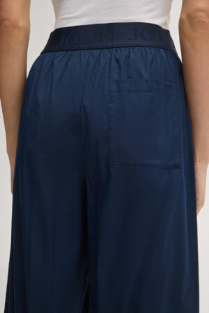 Vācu modes zīmola Joop! tumši zilas taisna piegriezuma sieviešu bikses ar elastīgu, sasienamu jostasvietu. Izgatavotas no kokvilnas maisījuma materiāla. Papildinātas ar kabatām un logo dizaina jostu mugurpusē.