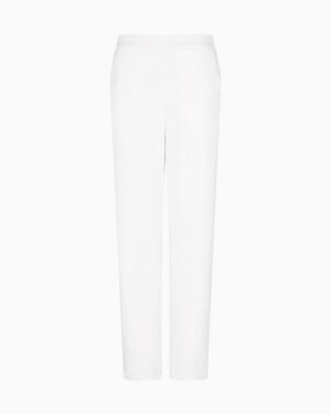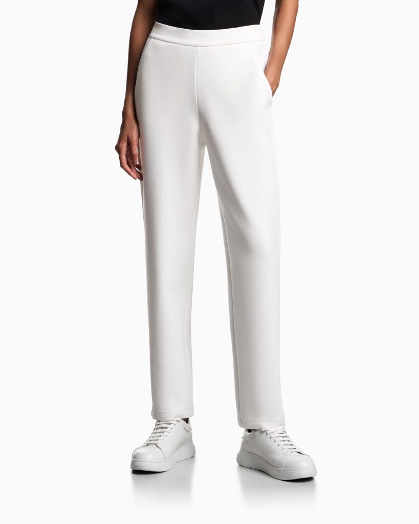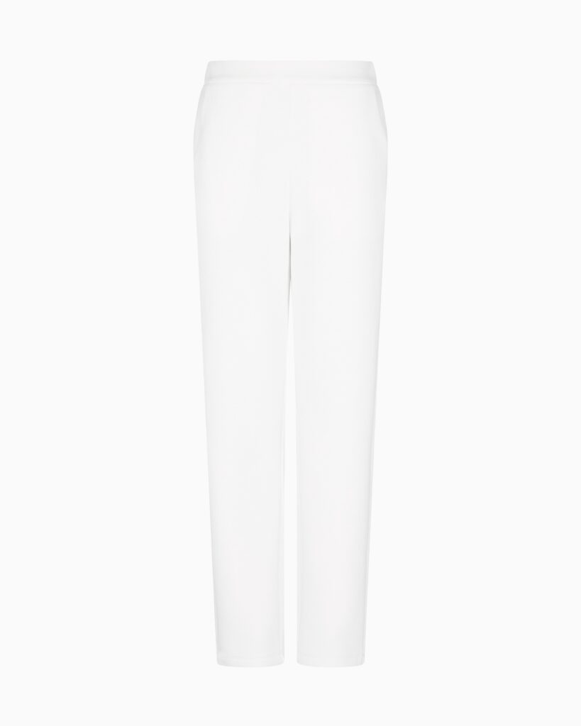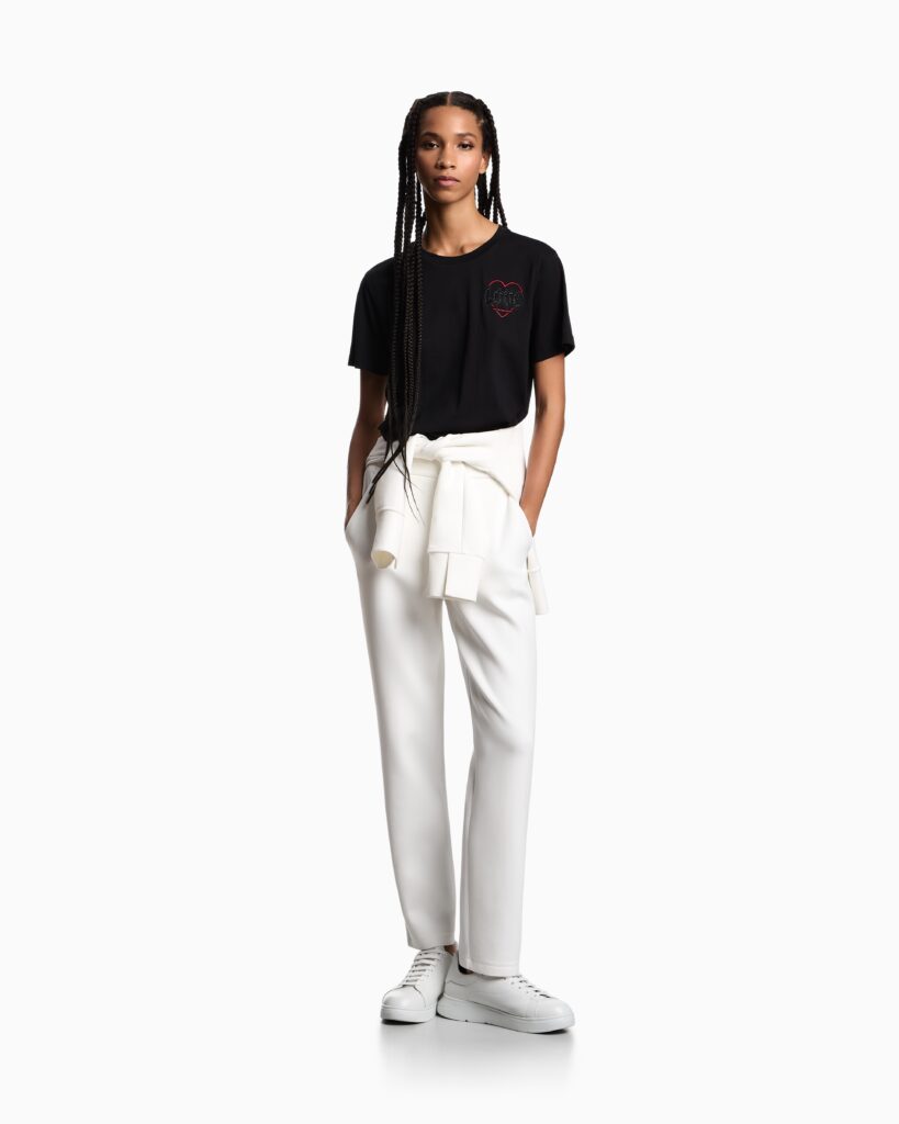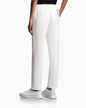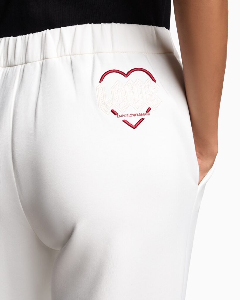 Itāļu luksusa zīmola Emporio Armani krēmbaltas sportiskā stila sieviešu bikses no Valentīndienai veltītās kapsulkolekcijas. Izgatavotas no mīksta un blīva džersija auduma. Papildinātas ar mugurpusē elastīgu jostasvietu. Akcentētas ar sirsniņas kontūras un logotipa izšuvumu, kā arī LOVE uzrakstu ar mirdzošiem akmentiņiem.