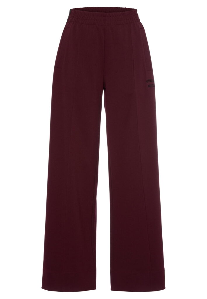 Vācu modes zīmola Marc Aurel plata piegriezuma sieviešu bikses ar elastīgu jostu bordo krāsā. Izgatavotas no elastīga poliestera un papildinātas ar vertikālām nošuvēm. Akcentētas ar melnām svītrām sānos un smalku Studio Aurel logo izšuvumu zem kabatas.