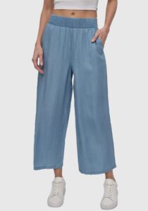 Vācu modes zīmola Marc Aurel plata piegriezuma sieviešu bikses ar elastīgu jostu bordo krāsā. Izgatavotas no elastīga poliestera un papildinātas ar vertikālām nošuvēm. Akcentētas ar melnām svītrām sānos un smalku Studio Aurel logo izšuvumu zem kabatas.
