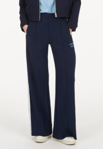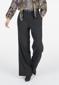 Itāļu modes zīmola Max Mara Leisure brīva piegriezuma, platas sieviešu bikses ar grafisku dizaina rakstu šokolādes brūnā, gaiši pelēcīgi bēšā un baltā tonī. Izgatavotas no 100% dabīgā zīda. Papildinātas ar elastīgu jostu un iešūtām sānu kabatām.