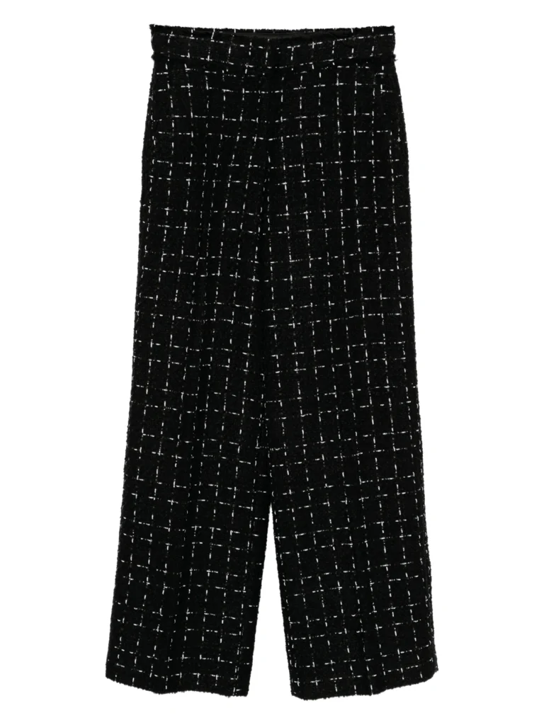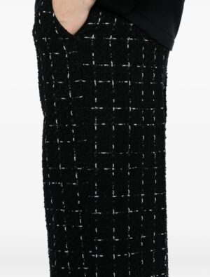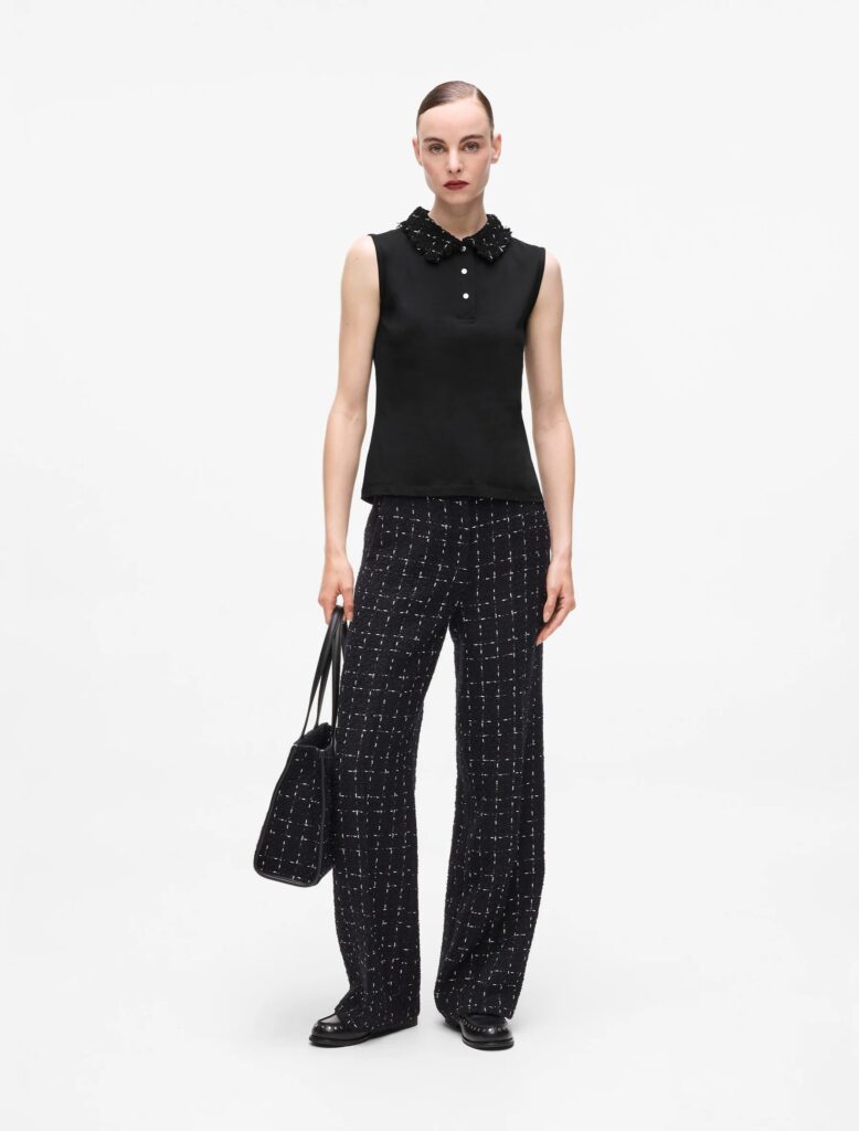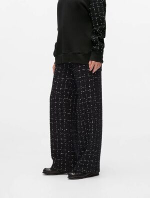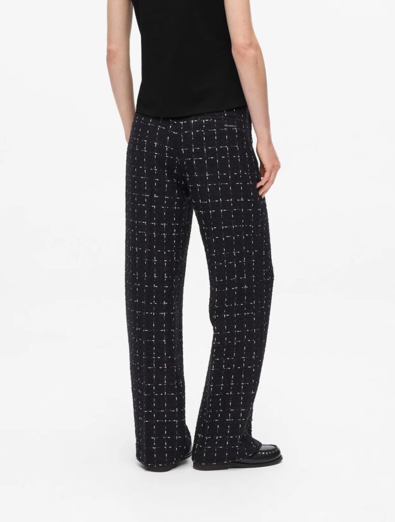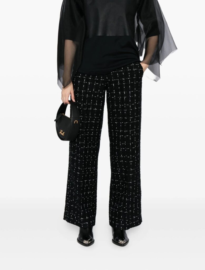 Vācu luksusa zīmola Karl Lagerfeld melnas sieviešu buklē auduma bikses ar vieglu kvardātveida rakstu, kas veidots no smalkām zīmola logotipa apdrukas lentītēm.