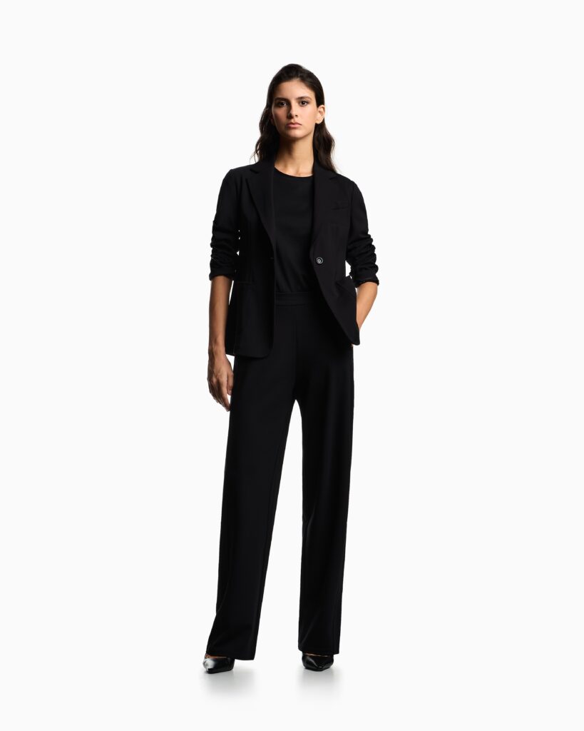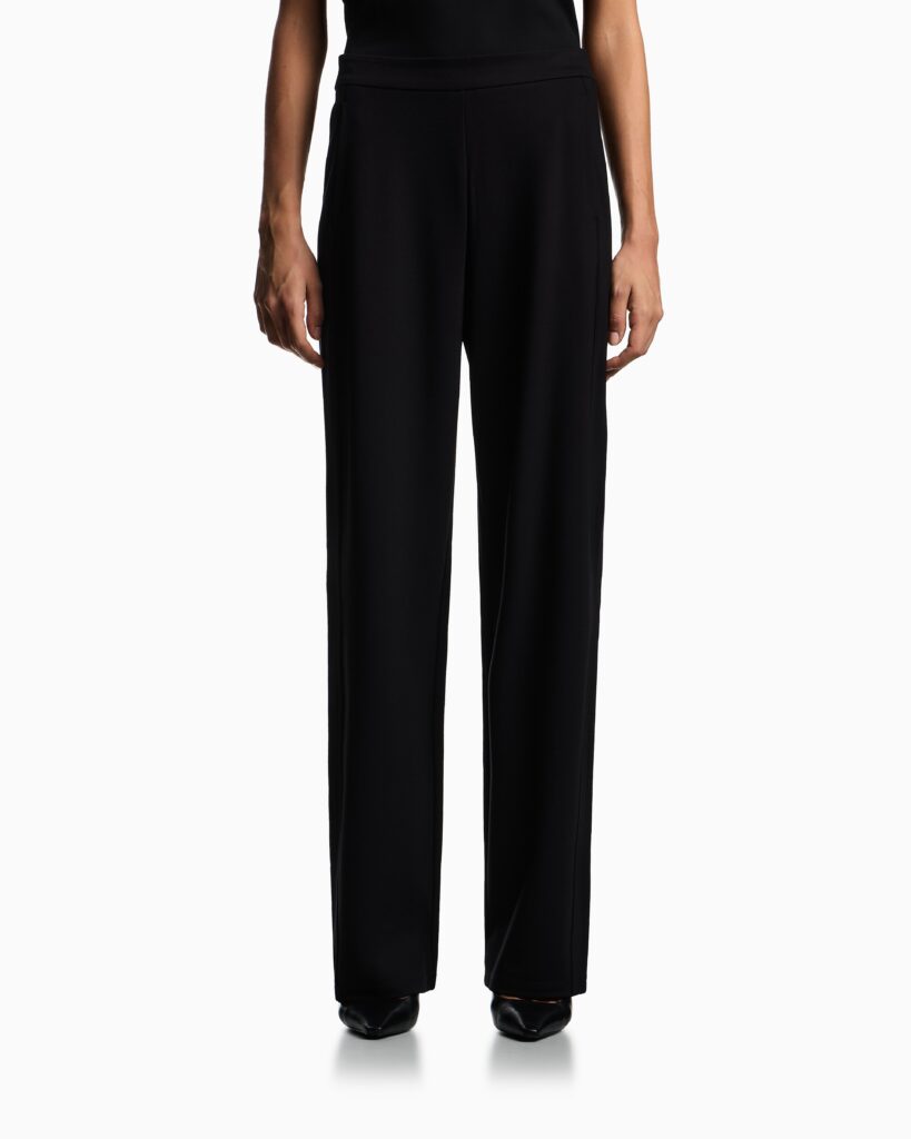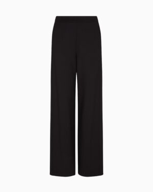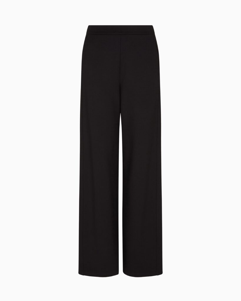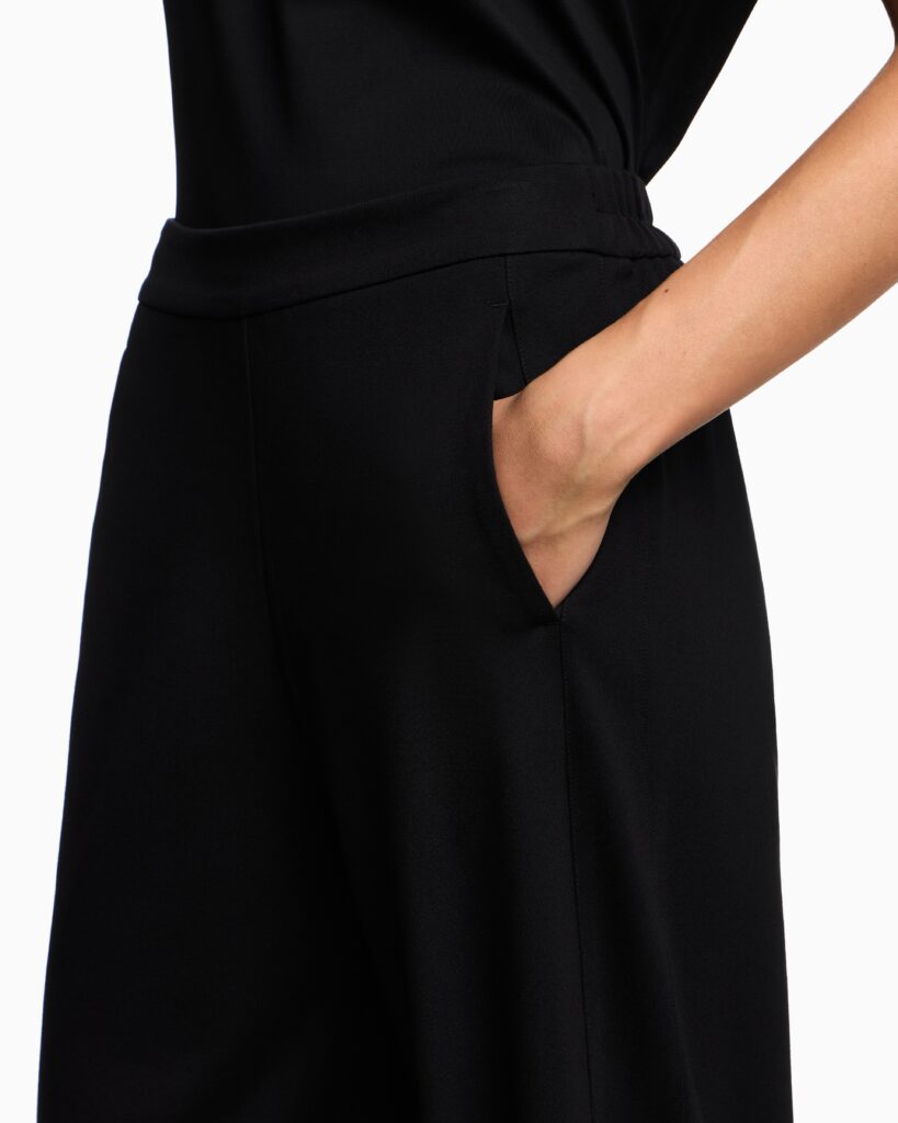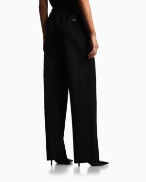 Itāļu luksusa zīmola Emporio Armani melnas brīva, taisna piegriezuma sieviešu bikses no Travel Essentials kapsulkolekcijas. Izgatavotas no stingra, blīva un elastīga viskozes maisījuma džersija auduma. Mugurpusē papildinātas ar elastīgu jostasvietu un kontrastējošu zīmola logotipa emblēmu.