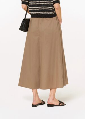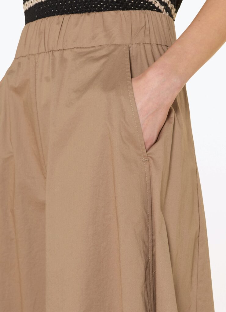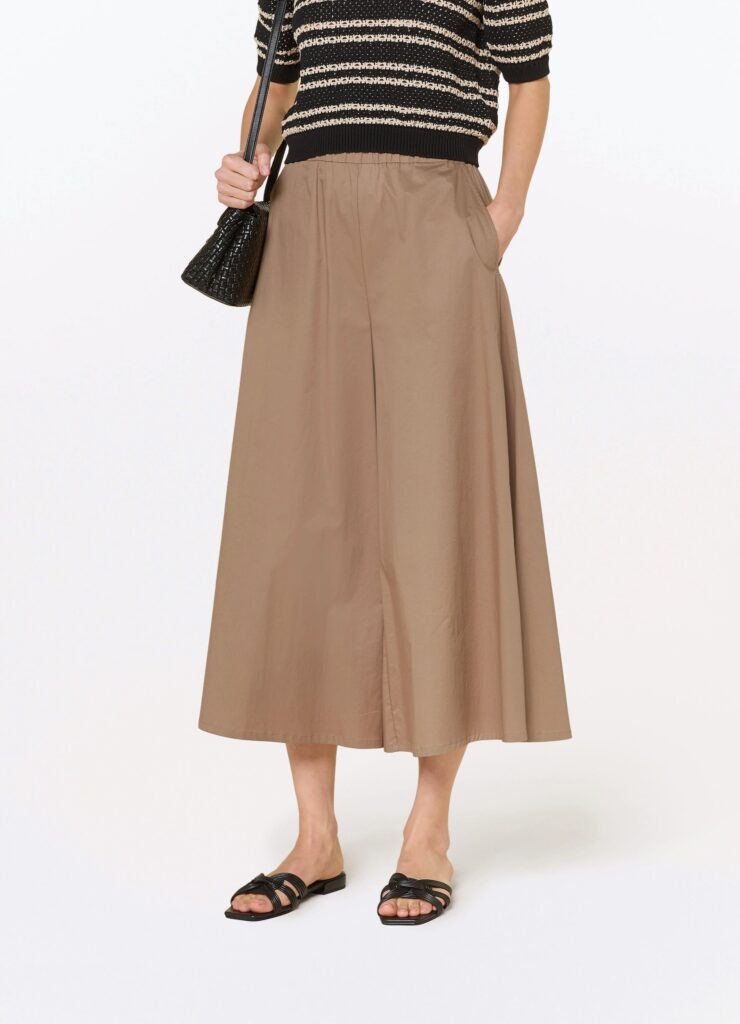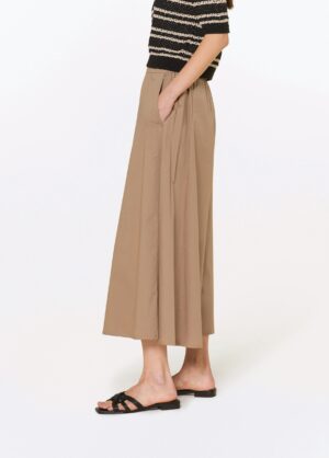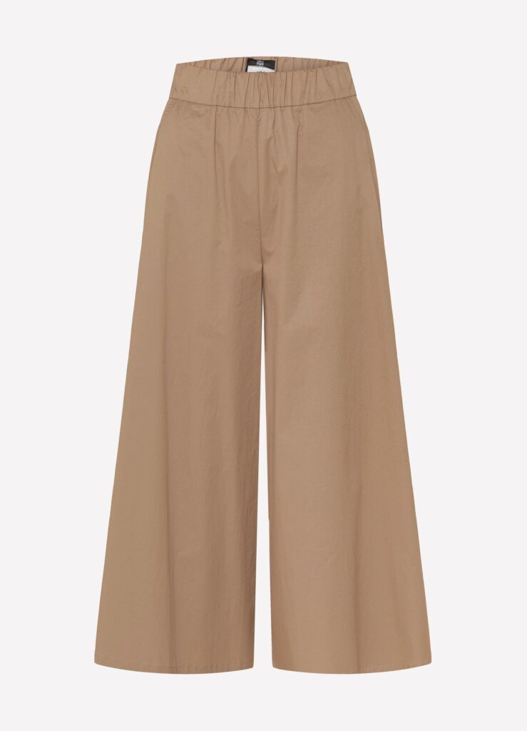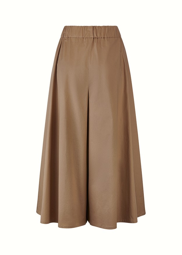 Vācu modes zīmola Riani īpaši platas svārkveida piegriezuma bikses kanēļa brūnā tonī. Izgatavotas no viegli elastīga augstākās kvalitātes kokvilnas poplīna. Papildinātas ar elastīgu jostasvietu un iešūtām sānu kabatām.