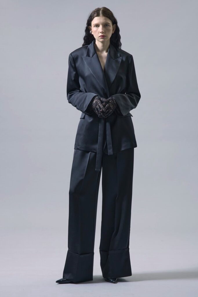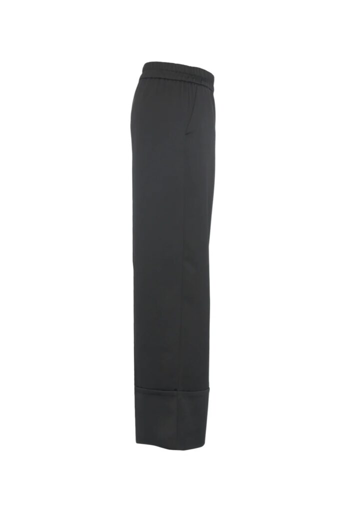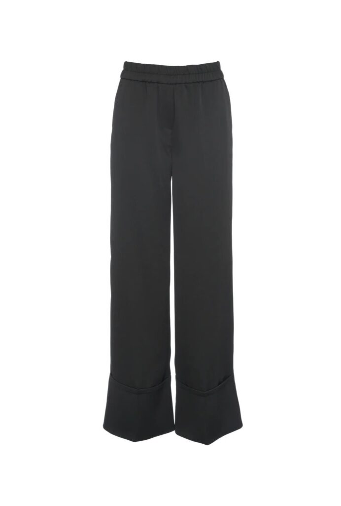Itāļu modes zīmola KAOS elegantas un ekstravagantas sieviešu bikses ar elastīgu jostu. Izgatavotas no melna atlasa auduma ar satīna spīdumu. Papildinātas ar platiem, fiksētiem atlokiem un iešūtām sānu kabatām.