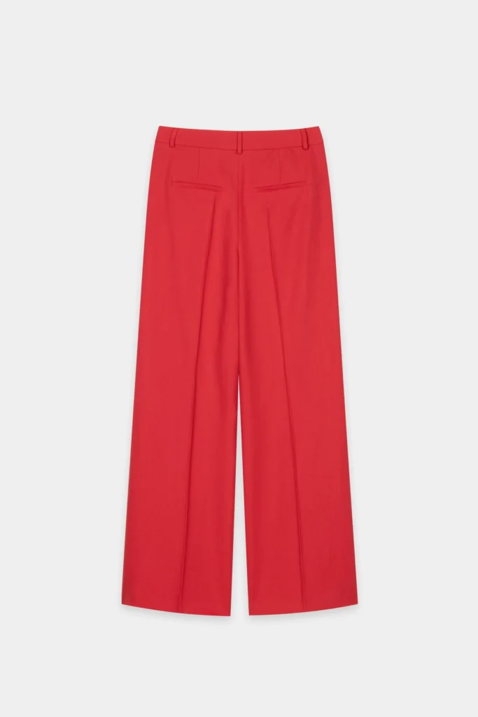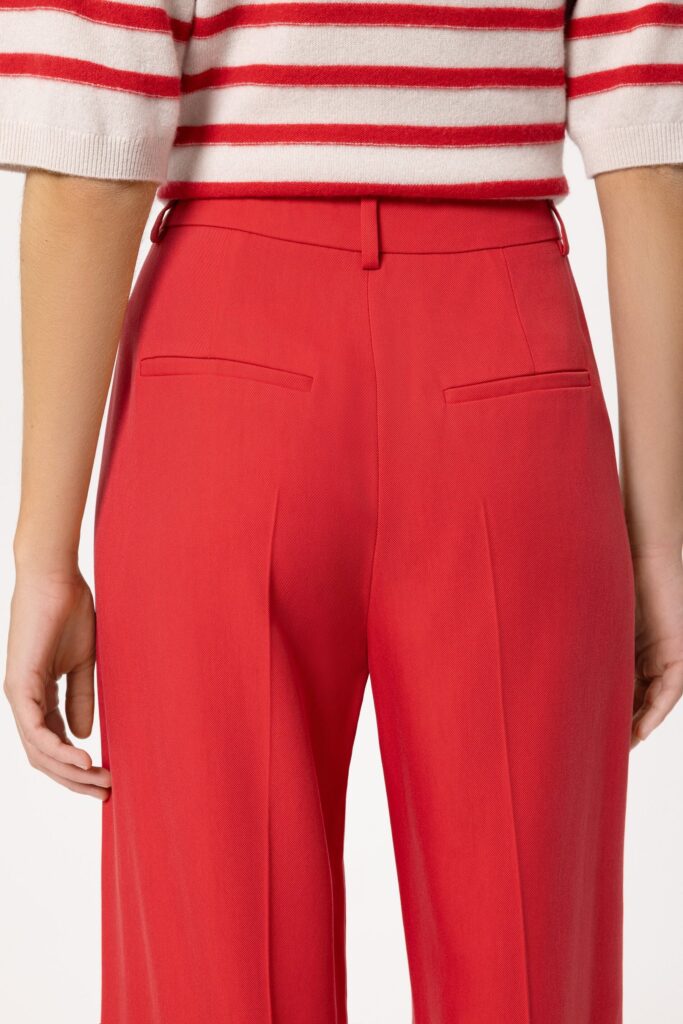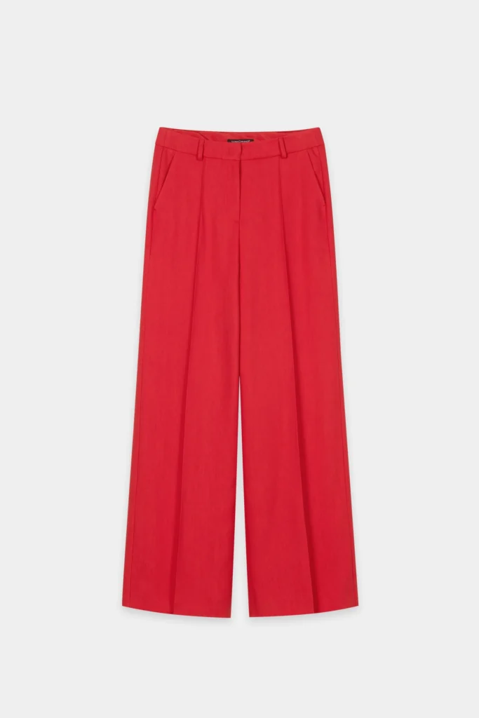 Vācu premium klases apģērbu zīmola Luisa Cerano īpaši garas plata piegriezuma sieviešu bikses sarkanā krāsā. Izgatavotas no stingra viskozes un liocela gabardīna auduma. Papildinātas ar iešūtām sānu un dekoratīvām mugurpuses kabatām.