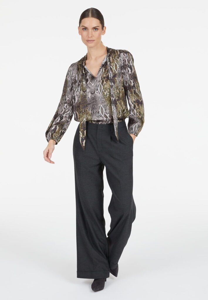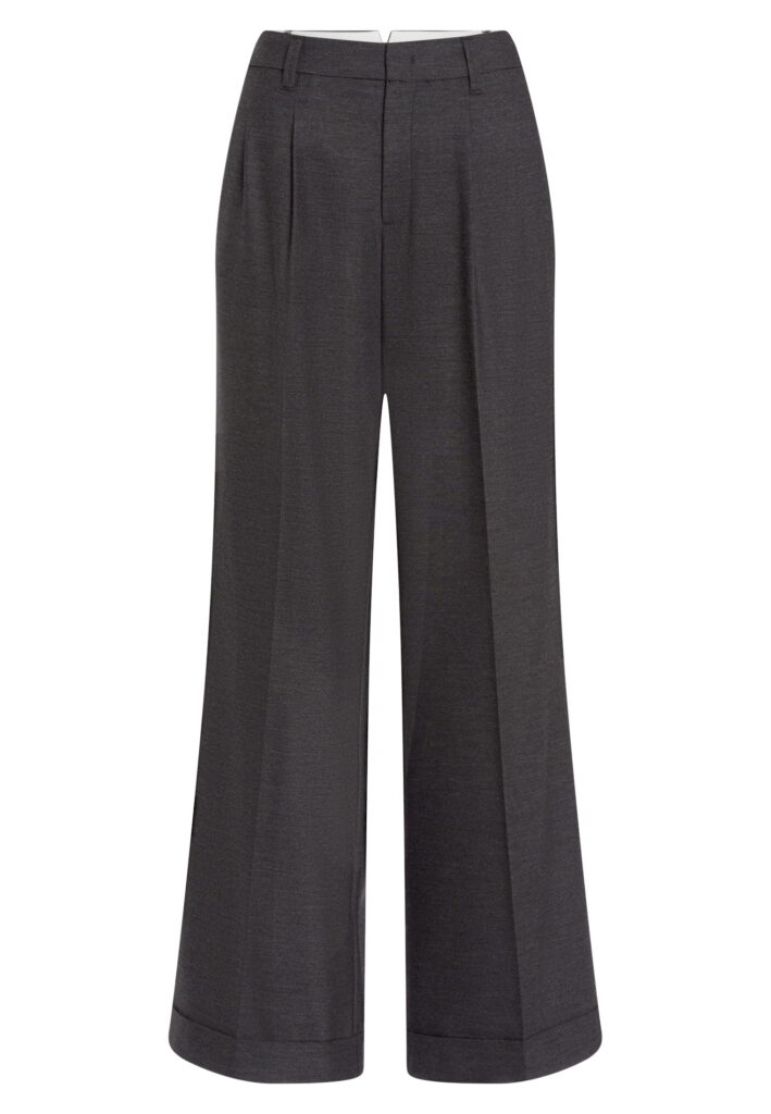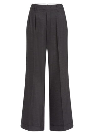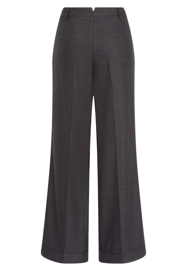 Vācu modes zīmola Marc Aurel plata piegriezuma sieviešu bikses tumši pelēkā krāsā. Izgatavotas no mīksta viskozes maisījuma materiāla ar vilnas struktūru. Papildinātas ar dekoratīvām ielocēm un fiksētiem atlokiem.
