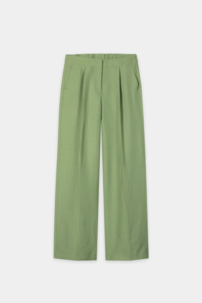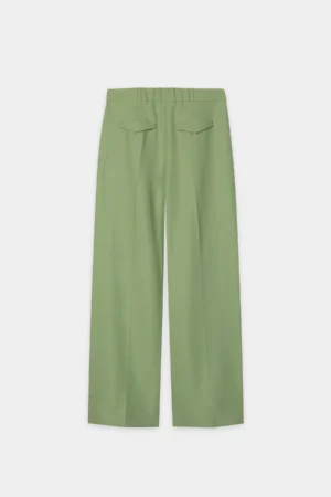 Vācu premium klases apģērbu zīmola Luisa Cerano dūmakaini zaļas plata piegriezuma sieviešu bikses ar ielocēm un elastīgu jostasvietu mugurpusē. Izgatavotas no augstākās kvalitātes linu maisījuma materiāla. Papildinātas ar iešūtām sānu kabatām un dekoratīviem mugurpuses kabatu atlokiem.