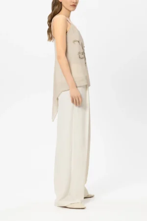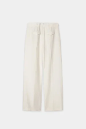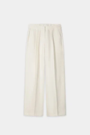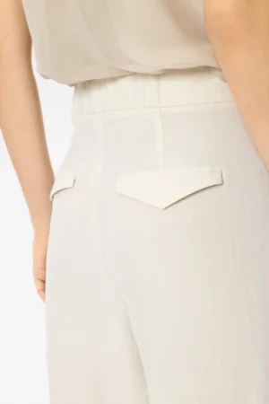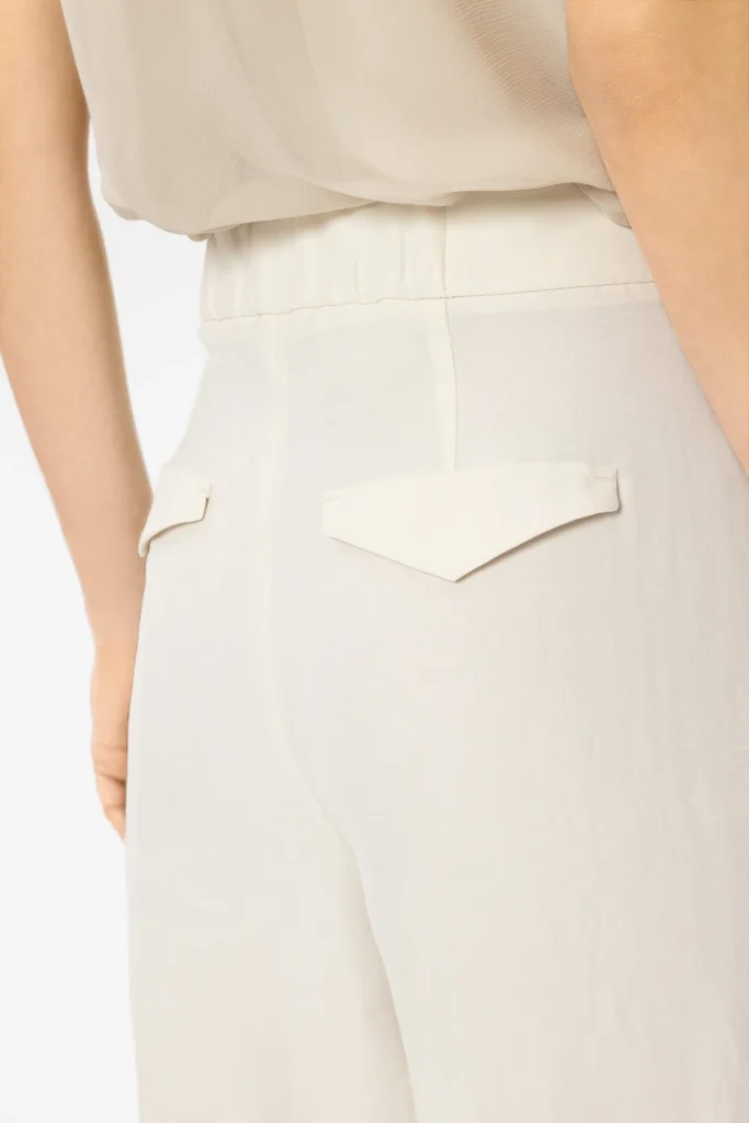 Vācu premium klases apģērbu zīmola Luisa Cerano krēmīgi bēšas plata piegriezuma sieviešu bikses ar ielocēm un elastīgu jostasvietu mugurpusē. Izgatavotas no augstākās kvalitātes linu maisījuma materiāla. Papildinātas ar iešūtām sānu kabatām un dekoratīviem mugurpuses kabatu atlokiem.