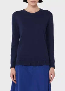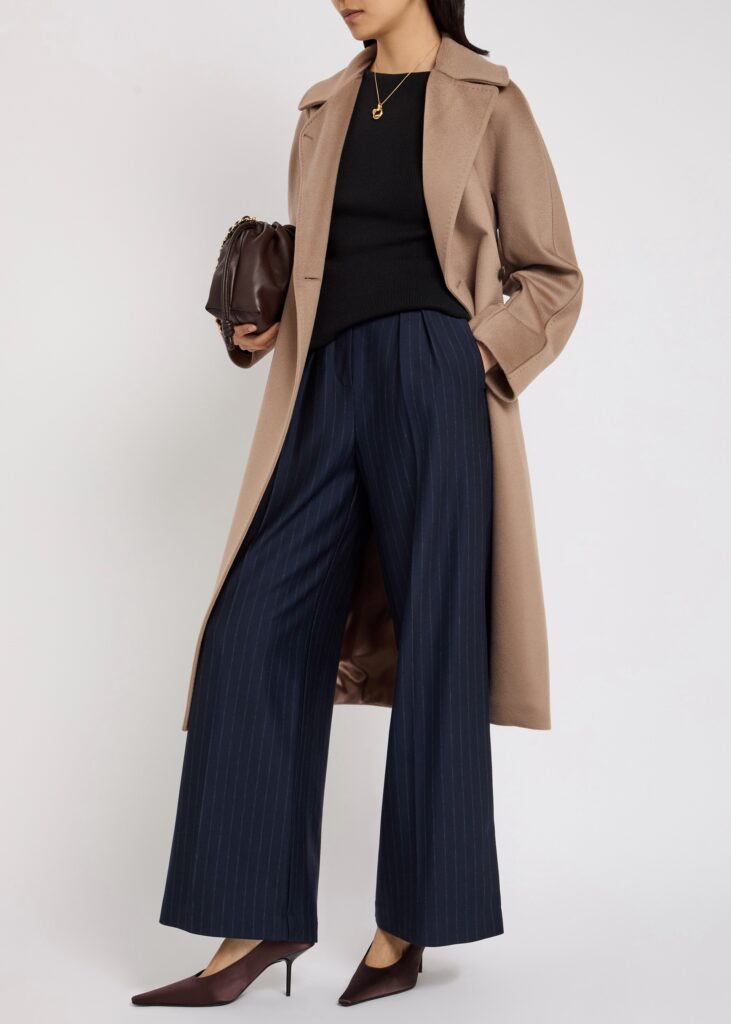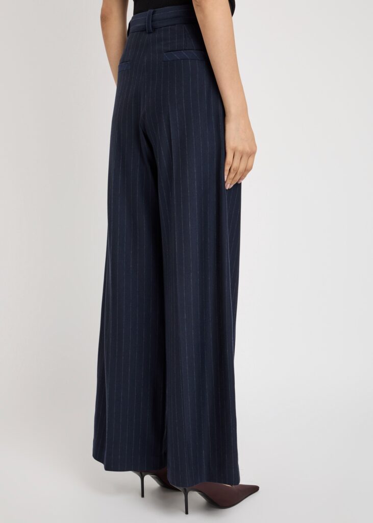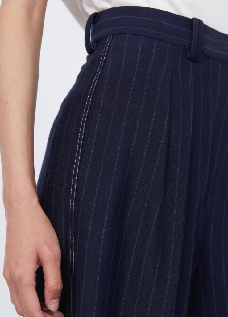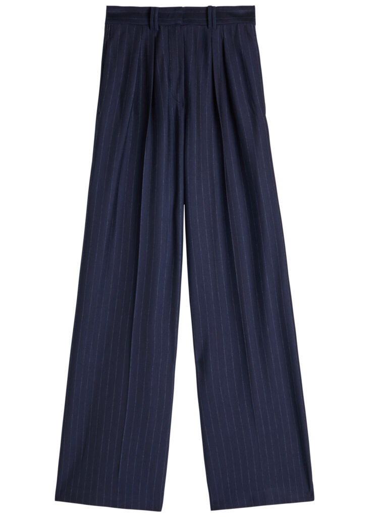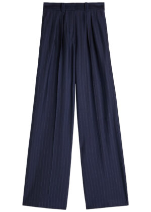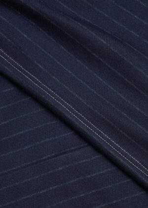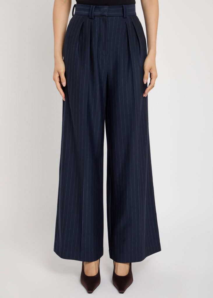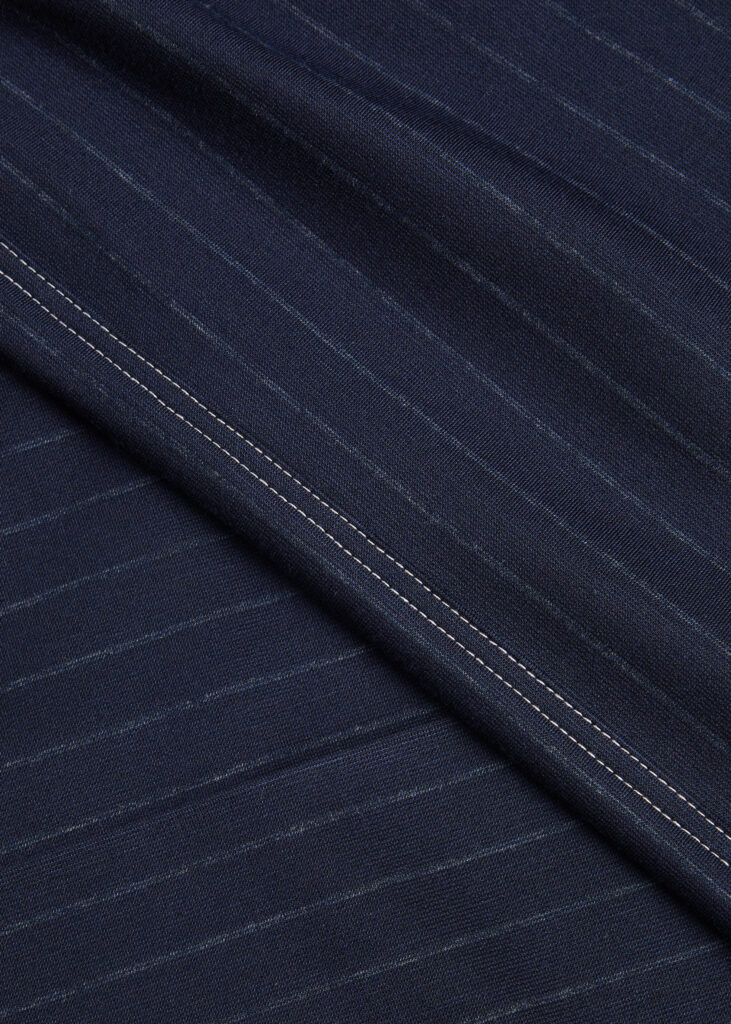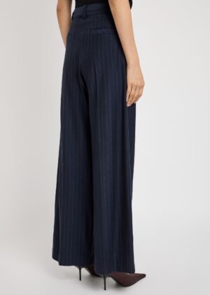 Itāļu modes zīmola MM by Max Mara tumši zilas plata piegriezuma sieviešu bikses no viskozes maisījuma materiāla ar mīkstu vilnas struktūru un smalku vertikālo svītru rakstu. Papildinātas ar dekoratīvām sānu nošuvēm un ielocēm, kā arī dubultām jostas cilpām un sānu kabatām.