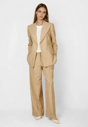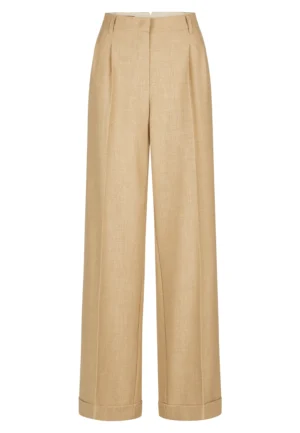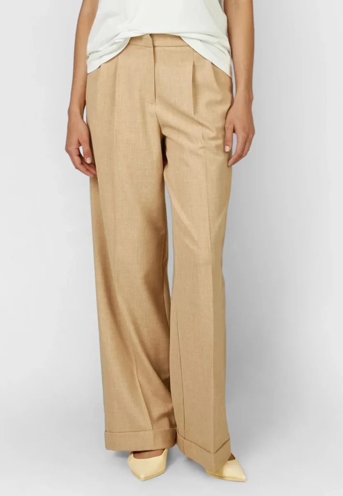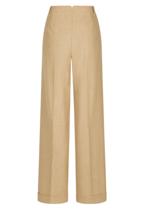 Vācu modes zīmola Marc Aurel platas taisna piegriezuma sieviešu bikses bēšā krāsā. Izgatavotas no viegli elastīga viskozes maisījuma melanža materiāla. Papildinātas ar dekoratīvām ielocēm un fiksētiem atlokiem.