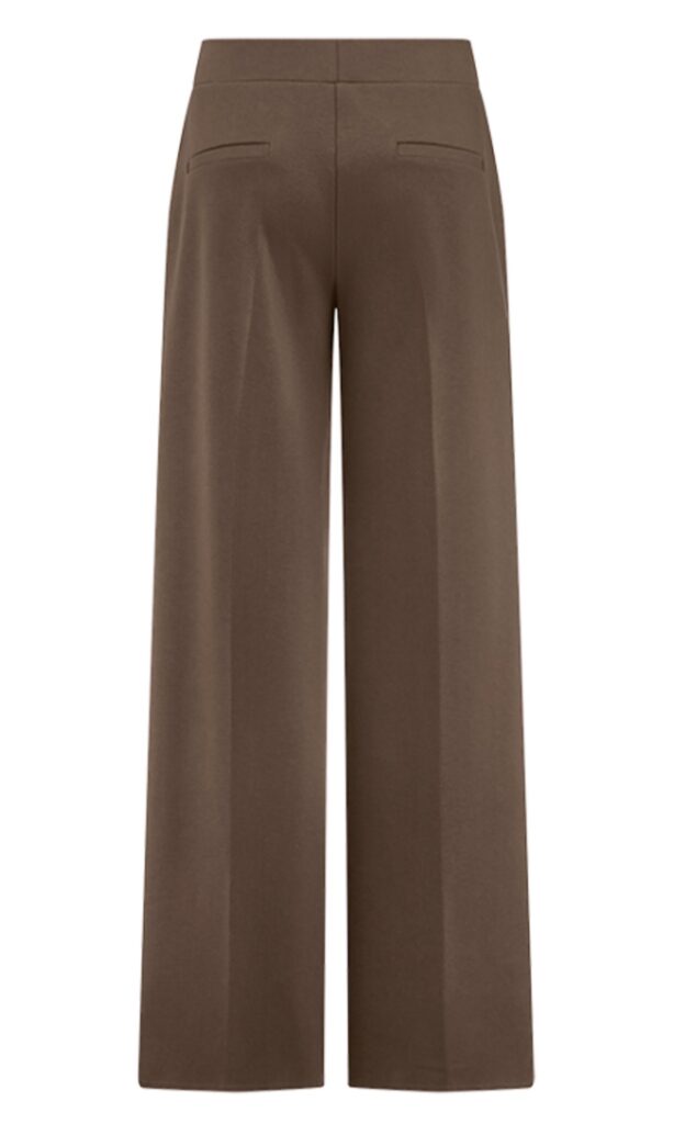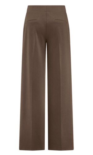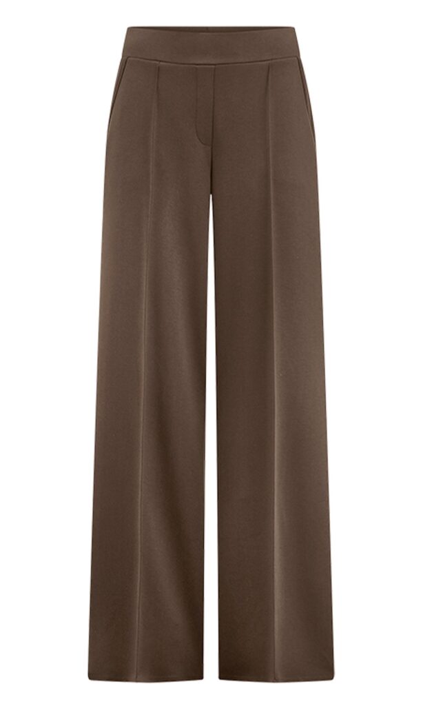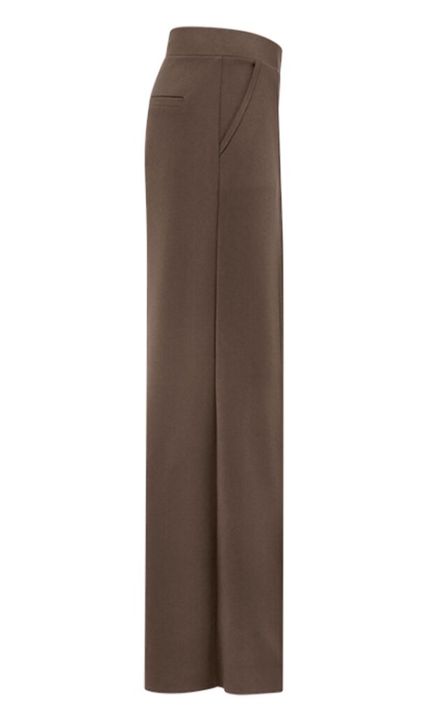 Vācu modes zīmola Riani plata piegriezuma sieviešu bikses tumši pelēkbrūnā krāsā. Izgatavotas no blīva, mīksta un elastīga augstākās kvalitātes trikotāžas materiāla. Papildinātas ar vertikālām nošuvēm, elastīgu jostasvietu un sānu kabatām.