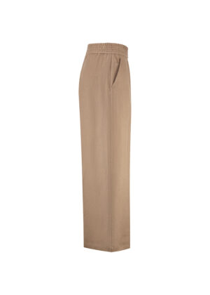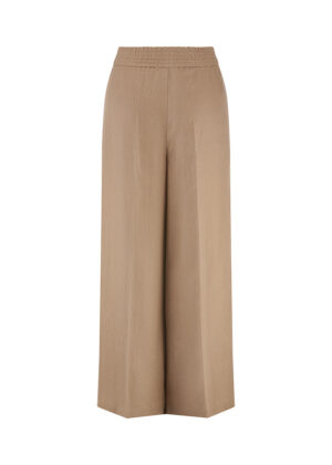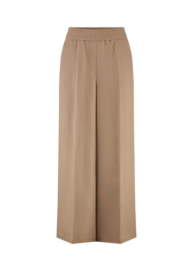 Vācu modes zīmola Riani platas taisna piegriezuma sieviešu bikses kanēļa brūnā krāsā. Izgatavotas no plūstoša un viegla augstākās kvalitātes linu materiāla. Papildinātas ar elastīgu jostasvietu un iešūtām sānu kabatām.