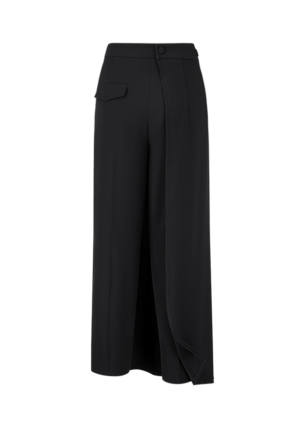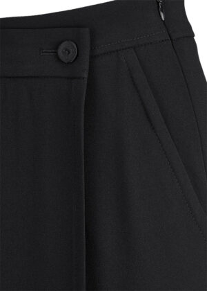 Vācu modes zīmola Riani melnas saīsināta piegriezuma sieviešu bikses ar piepogājamu svārku daļu. Izgatavotas no plūstoša satīna struktūras materiāla. Papildinātas ar rāvējslēdzēja aizdari sānā un dekoratīvu kabatas atloku mugurpusē.